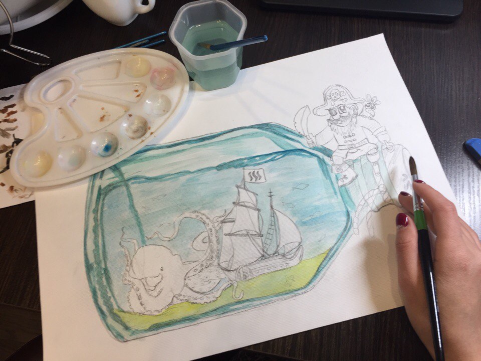 This time, I've changed my sketch a little. I started painting it in the evening, when I was beginning to sleep, I decided to postpone drawing until the next day, until today. But when I looked at the sketch in the morning, I decided to change the picture a little. I did not like the octopus, so I erased it with the eraser and painted another. I think this one is better.