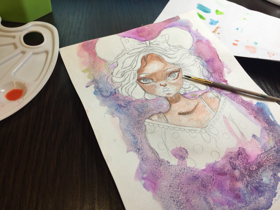 Then my favorite stage. I love to draw a background. This time I shot you a video as I put paint on the background. On one of the video you can see how beautifully the colors merge and flow. To do this, you need to soak the leaves of the paper. Only water and a brush are needed. Wipe the sheet with a loose main drawing.