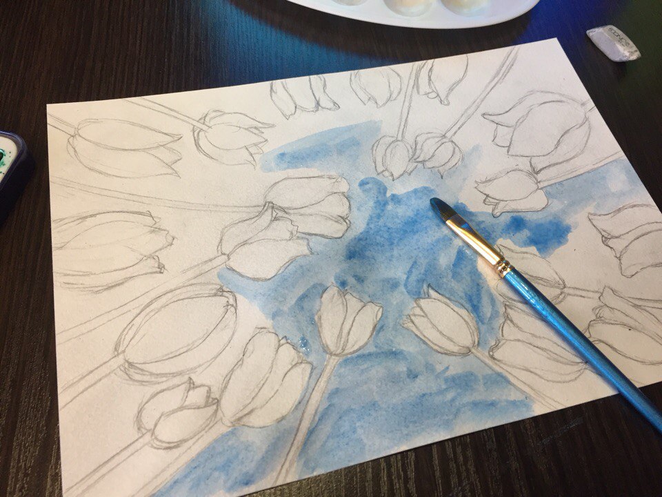 First of all, my work began with a sketch. With the help of a pencil I drew flowers. Everywhere as an easy drawing, but it was difficult to draw under such foreshortenings. But I did it :)