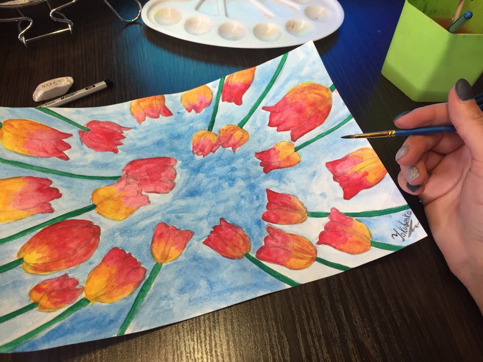 Then I started to paint flowers. In order to color the flowers, I used two colors: yellow and pink. In general, the tulips are of different colors: yellow, pink, red, dark blue, violet :)