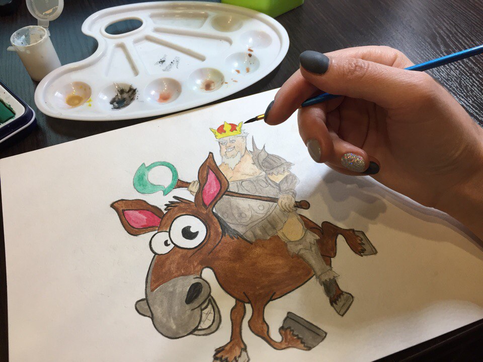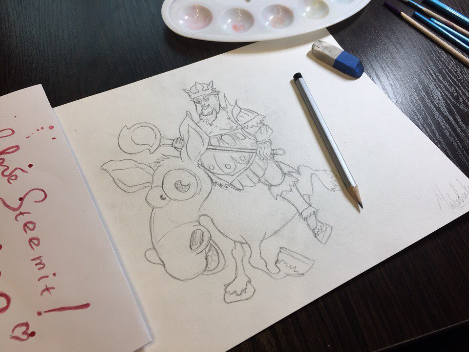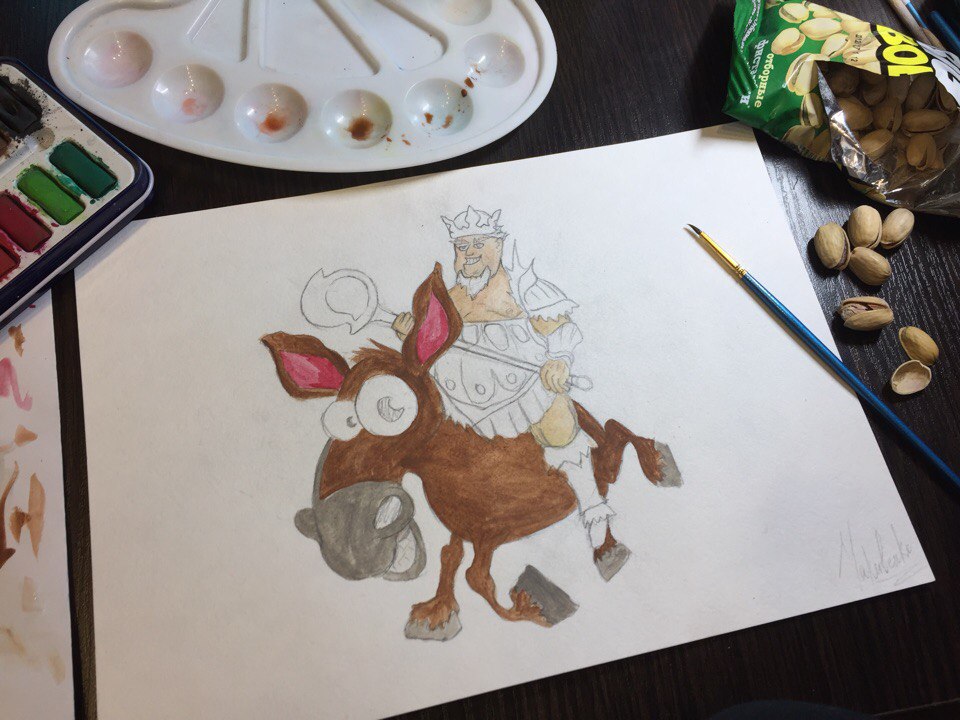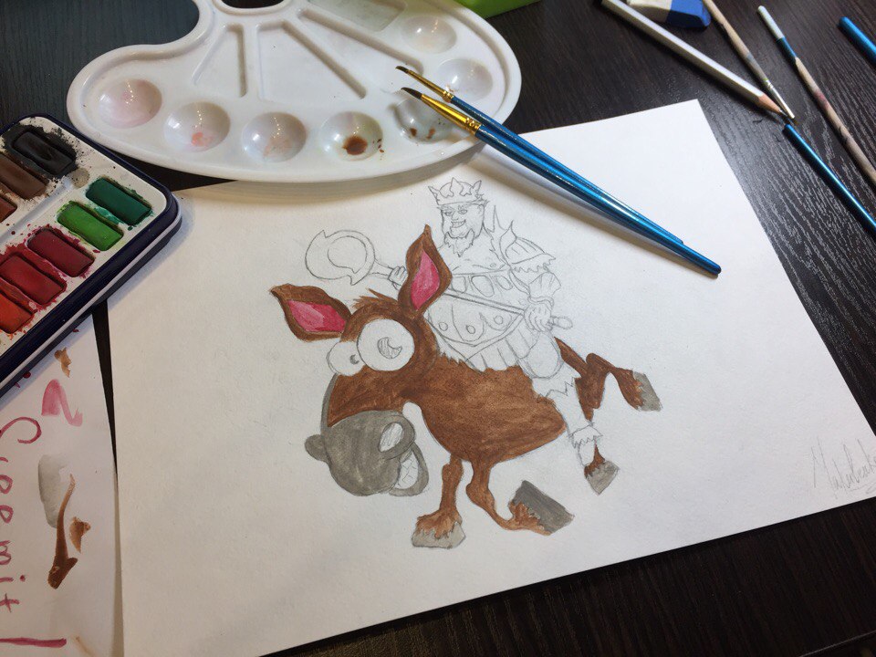 The next stage, there is not no background, there is no blue as always. This time without a background. More precisely with the background, only it is white. It's not quite familiar to me. It's my favorite stage to paint over the background. At this point, I can experiment well. I could hardly restrain myself from painting the background. and I succeeded. So, this time at the second stage I started the main drawing. I started painting the donkey.