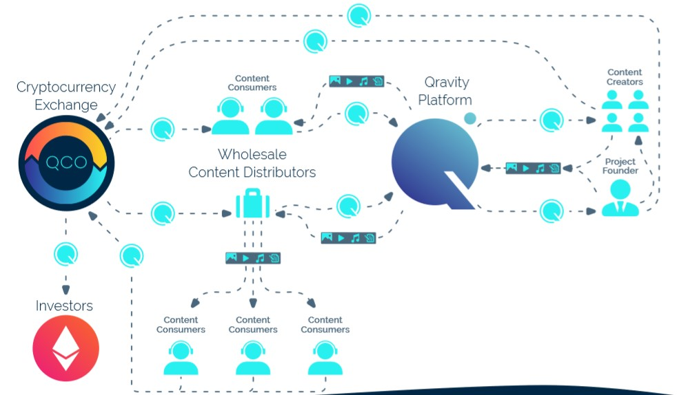 Qravity pays royalties in QCO every time a distributor licesnses content or a consumer buys or rents platform content. The model is similar to existing distribution and streaming models and uses QCO as its cryptocurrency. This makes project revenue transparent for all stakeholders.