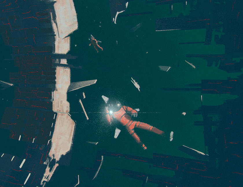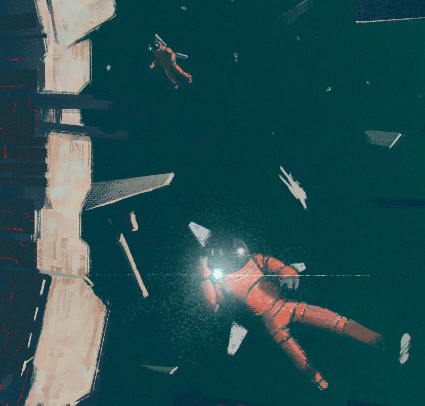 Really loving the way you use dark tonality on the spaceship's backdrop. It really brings out the orange of the astronauts' outfits, like specks of hope (and life) in an otherwise dark canvas.