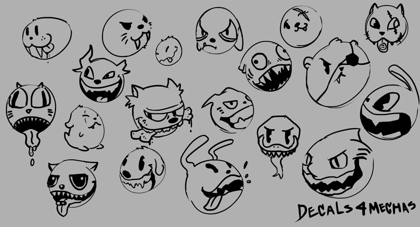 Forgot about these in a long time. I started sketching these for a crazy idea of military mechas, that were hacked and used in rebellious and subversive acts by insurgent characters. The hacked mechas were painted by insurgents, and they painted these faces on various mechas giving them some character and also a name for the cause.