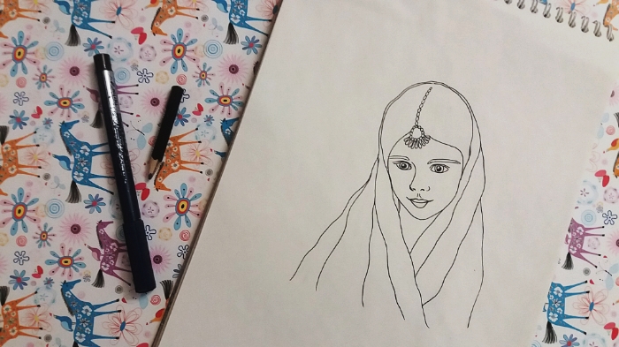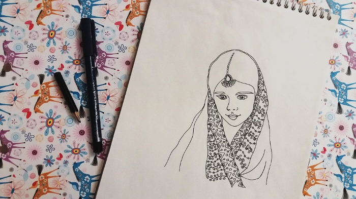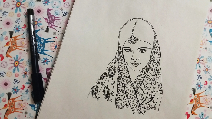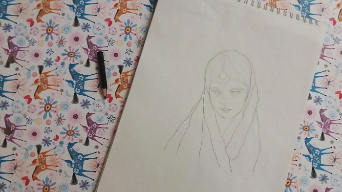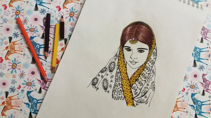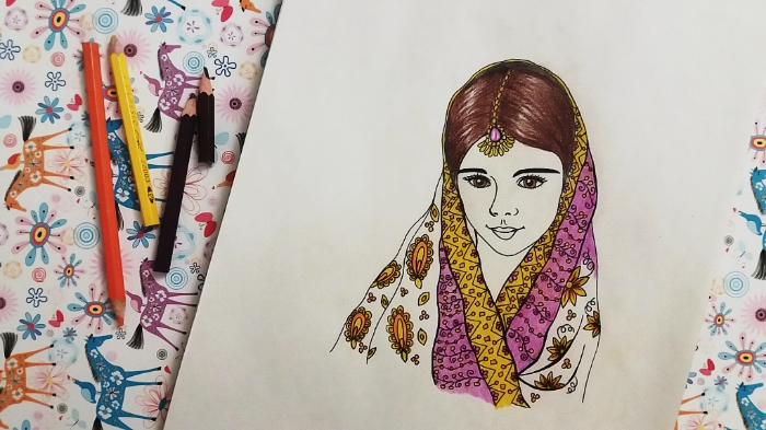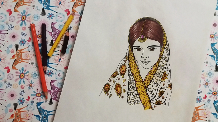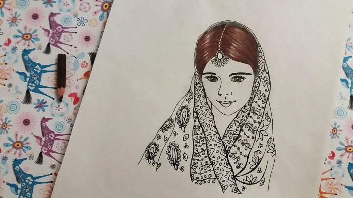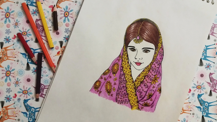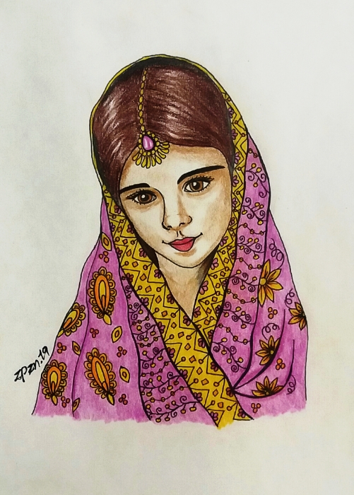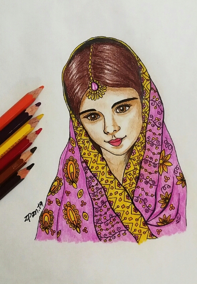 She had a scarf on her head.. with flowers on it..I used yellow, orange and purple to paint the scarf.. using colored pencils made her clothes colorful..