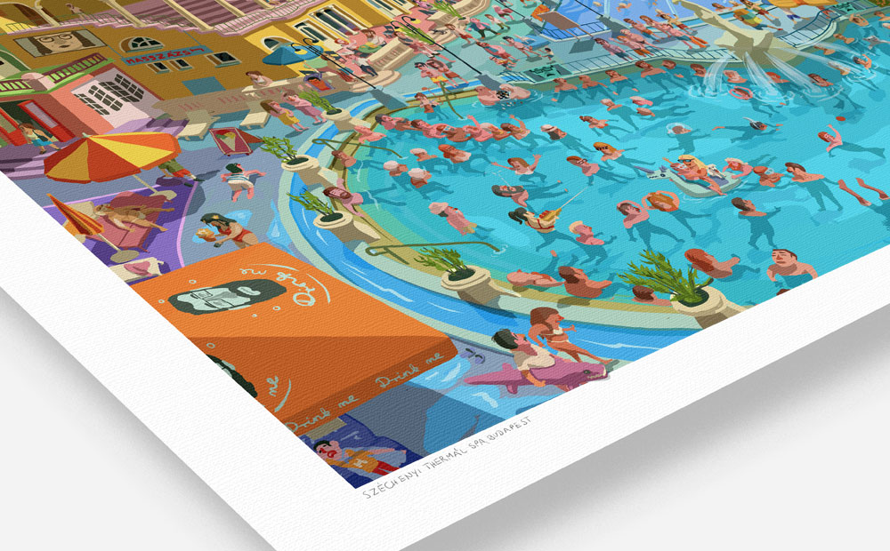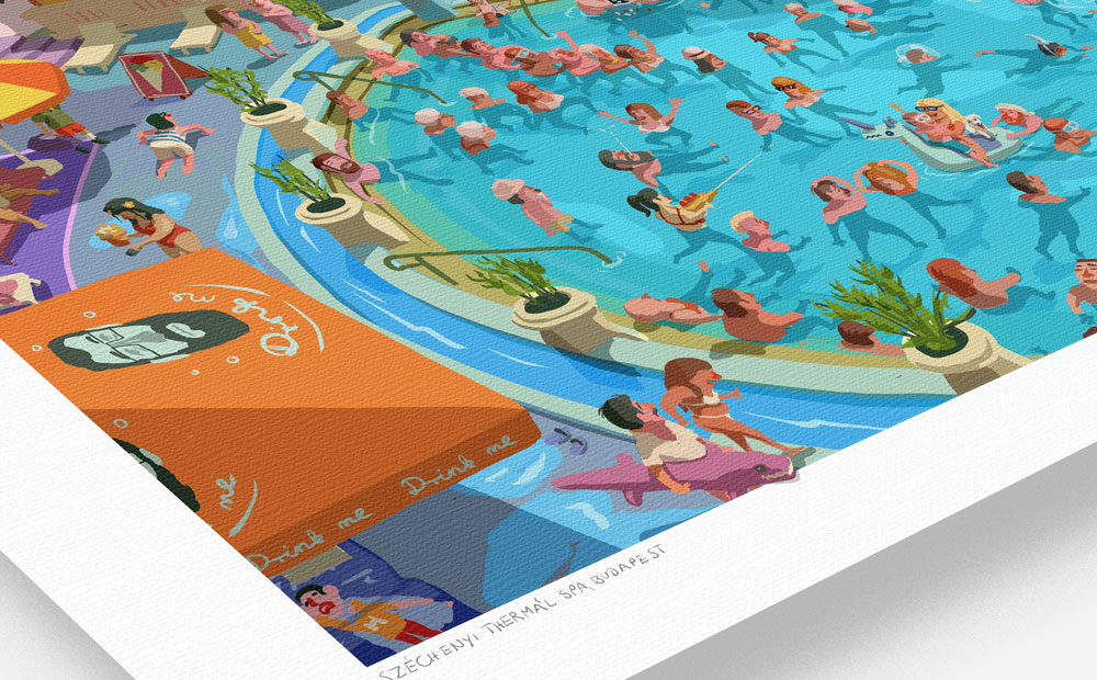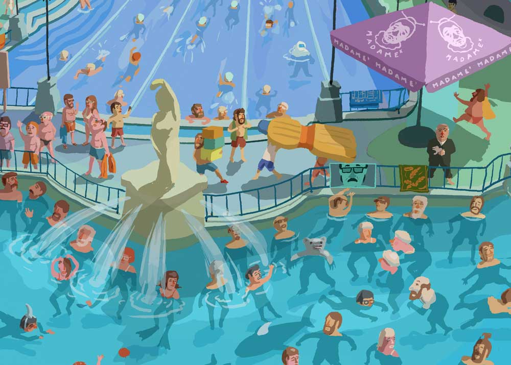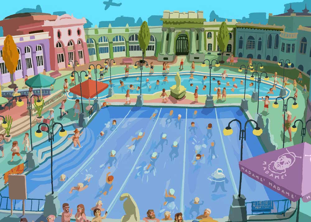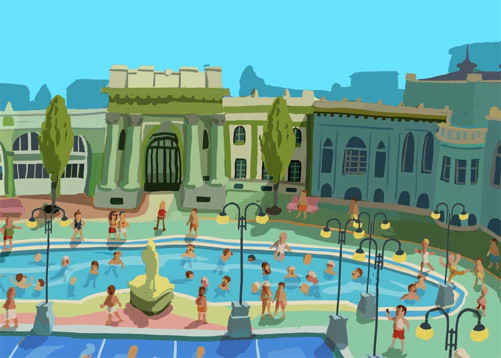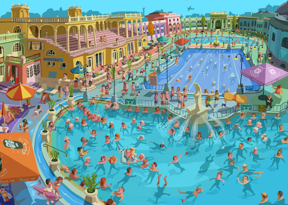 My illustration about Szechenyi Thermal Spa with bear, shark, mermaid and Hitchcock... :)