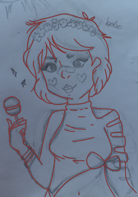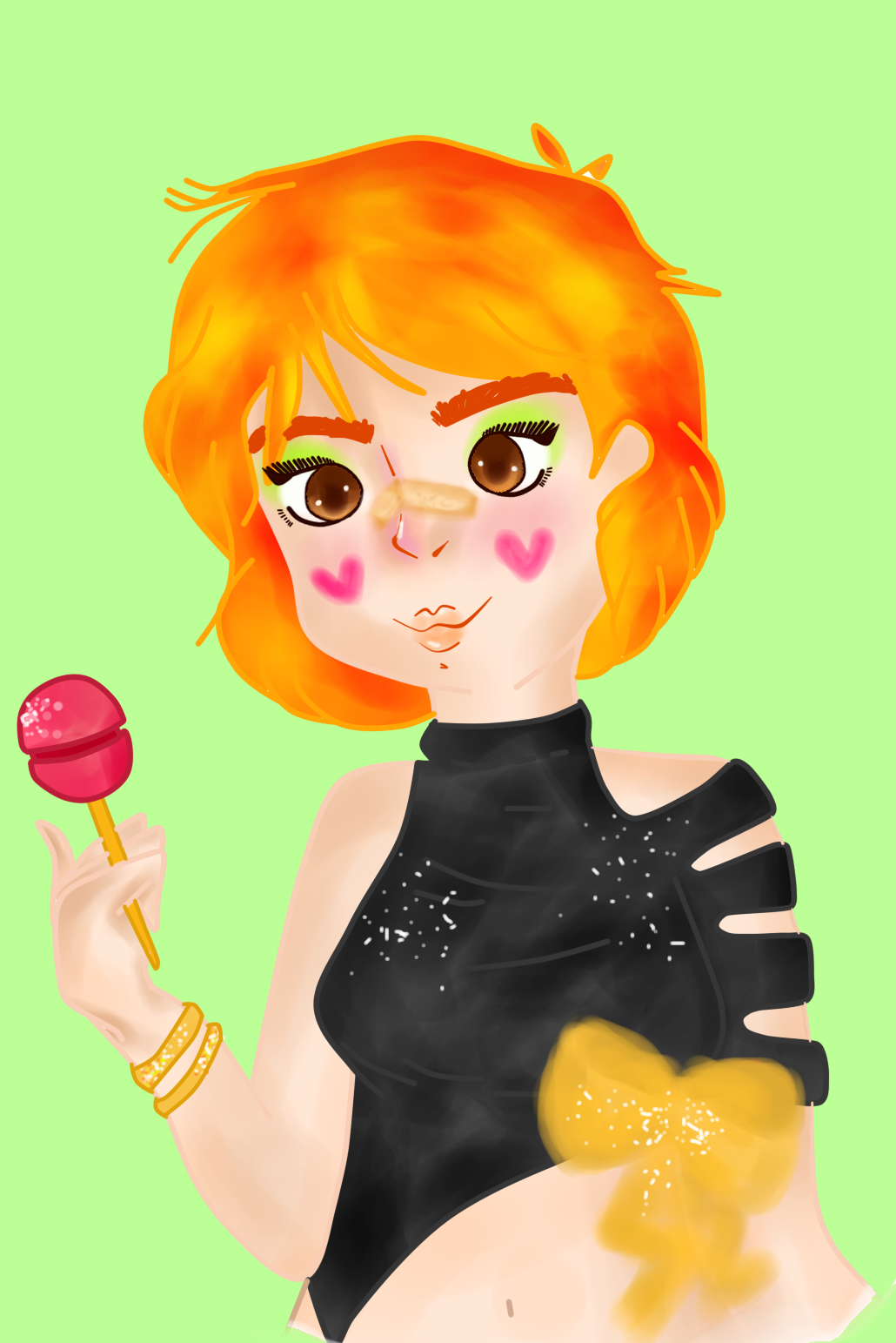 Finally, I have made various adjustments to the drawing, such as placing hearts on the cheeks, green shading of the eyes, some white points in various parts of the drawing to make the effect of "bright" and the yellow bow highlighting with the color of its hair. It should be noted that I added a kind of cure on the part of her nose, because days ago I saw a girl with this and I liked how she looked haha.