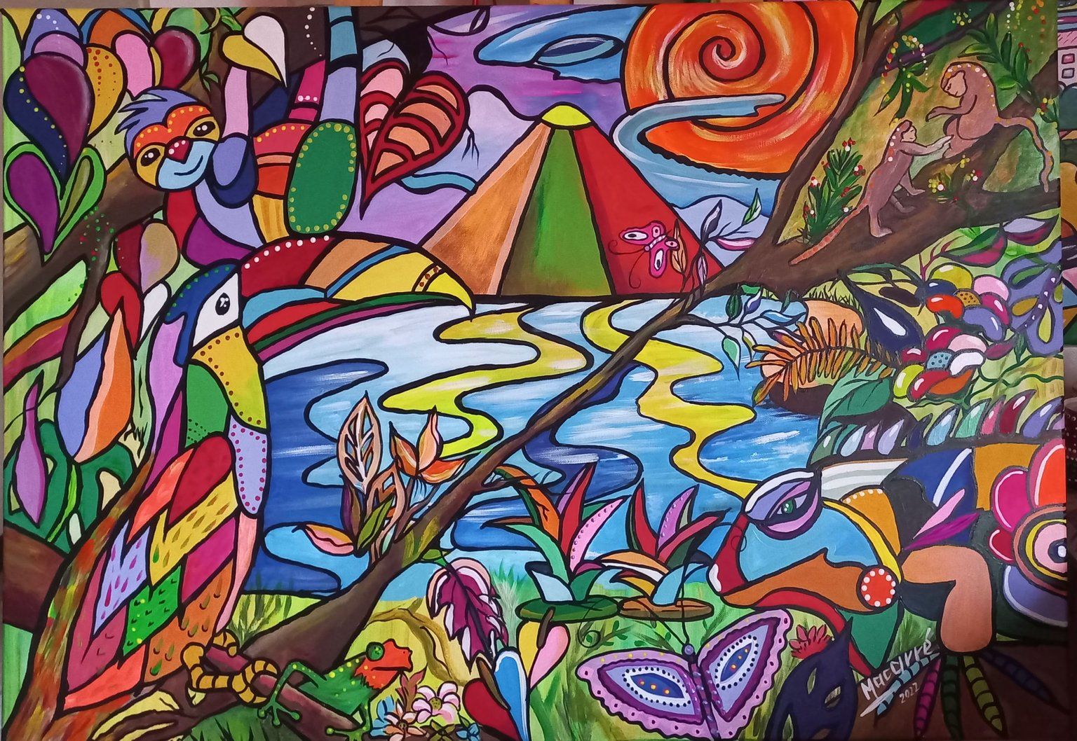 Esta obra la pinté como quien invoca. No quise representar la selva, quise sentirla. Cada animal que aparece fue canalizado, no dibujado. El tucán, el perezoso, la rana, los monos aulladores, la mariposa… todos llegaron a mí como mensajeros de algo más profundo.
