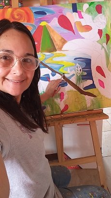 Usé colores sin miedo, como siempre. El rojo es fuego interno, el morado es misterio, el verde es renacimiento. El río que atraviesa la obra es mi respiración, mi flujo creativo. Las líneas no son contornos, son caminos. Los puntos no son detalles, son pulsos.