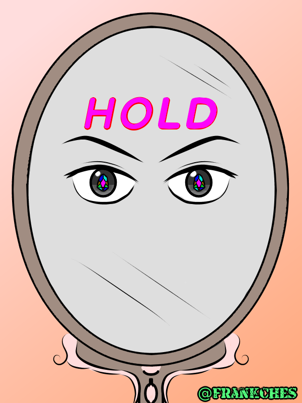 La idea que se me habia ocurrido fue dibujar en un espejo a una mujer abriendo los ojos y que expresara algun tipo de sorpresa o asombro al ver que el espejo le reflejara el "Hold" y que sus pupilas tuvieran el token de Pixeos. Pero mientras trazaba sentí que poco a poco perdí las ganas de dibujar y solo queria irme a dormir.
