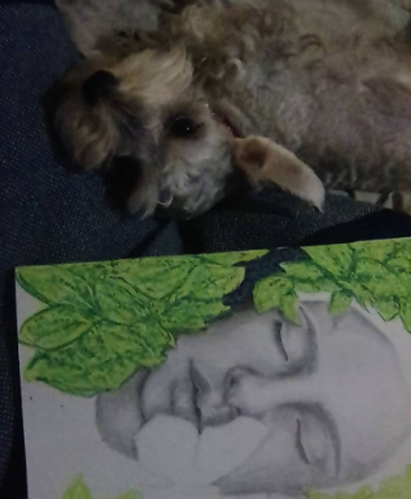 Y el más importante (olvidé tomarle una foto con mi firma al dibujo, de paso la cámara era prestada 😅) menos mal que hay una Lunita que esta siempre acostada a mi lado cuando dibujo, lo más bonito que existe en mi vida.