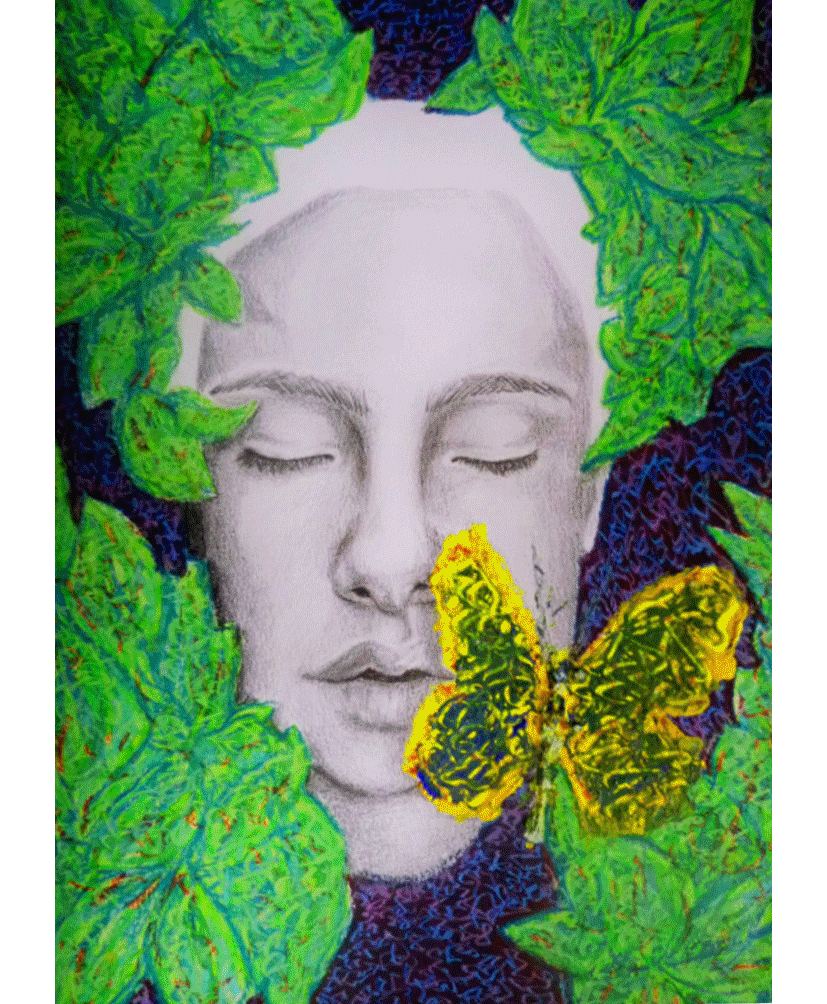 A nice picture, Saouri :) The monochrome face contrasts interestingly against the leaves and the butterfly :) I like it!