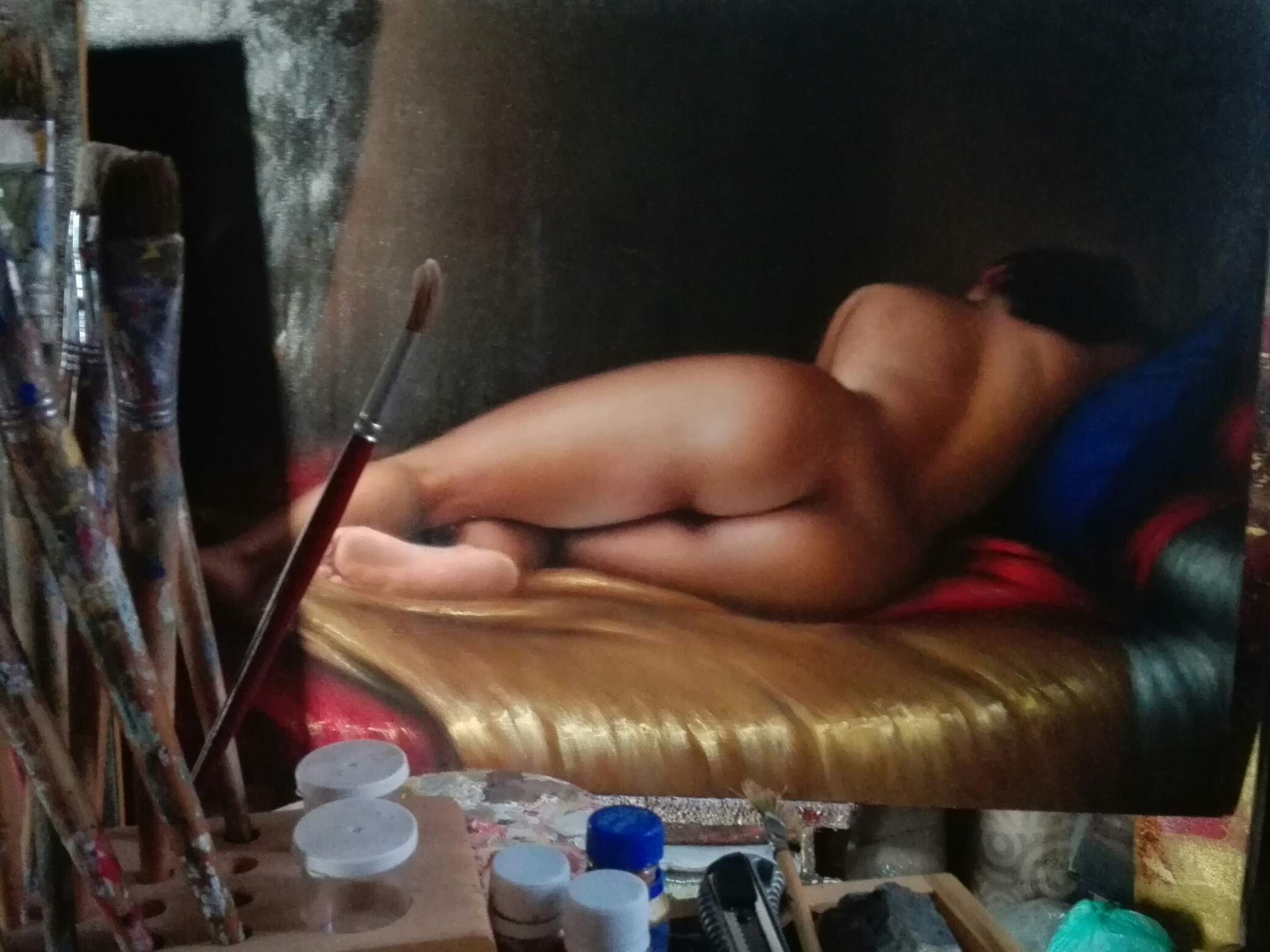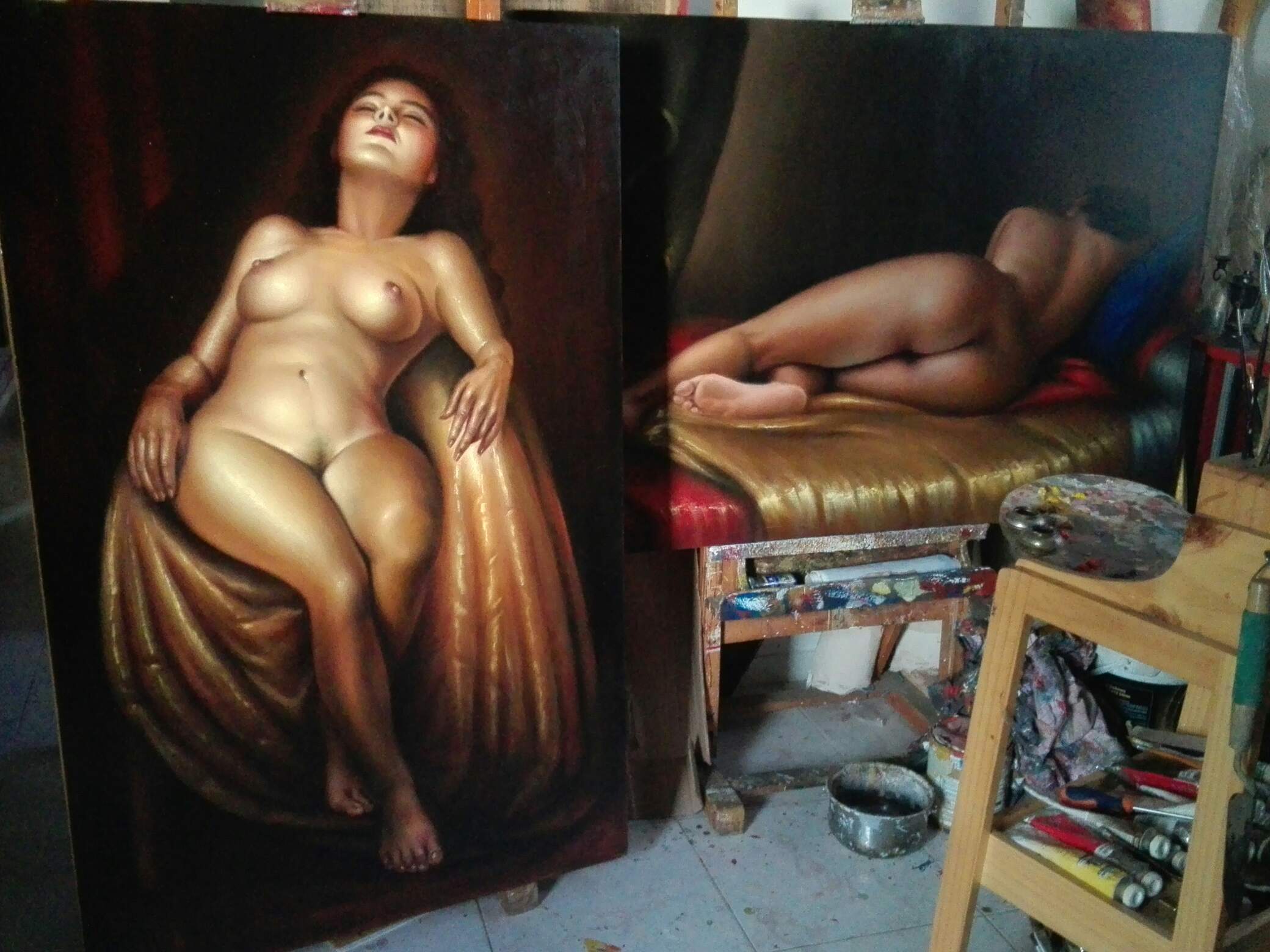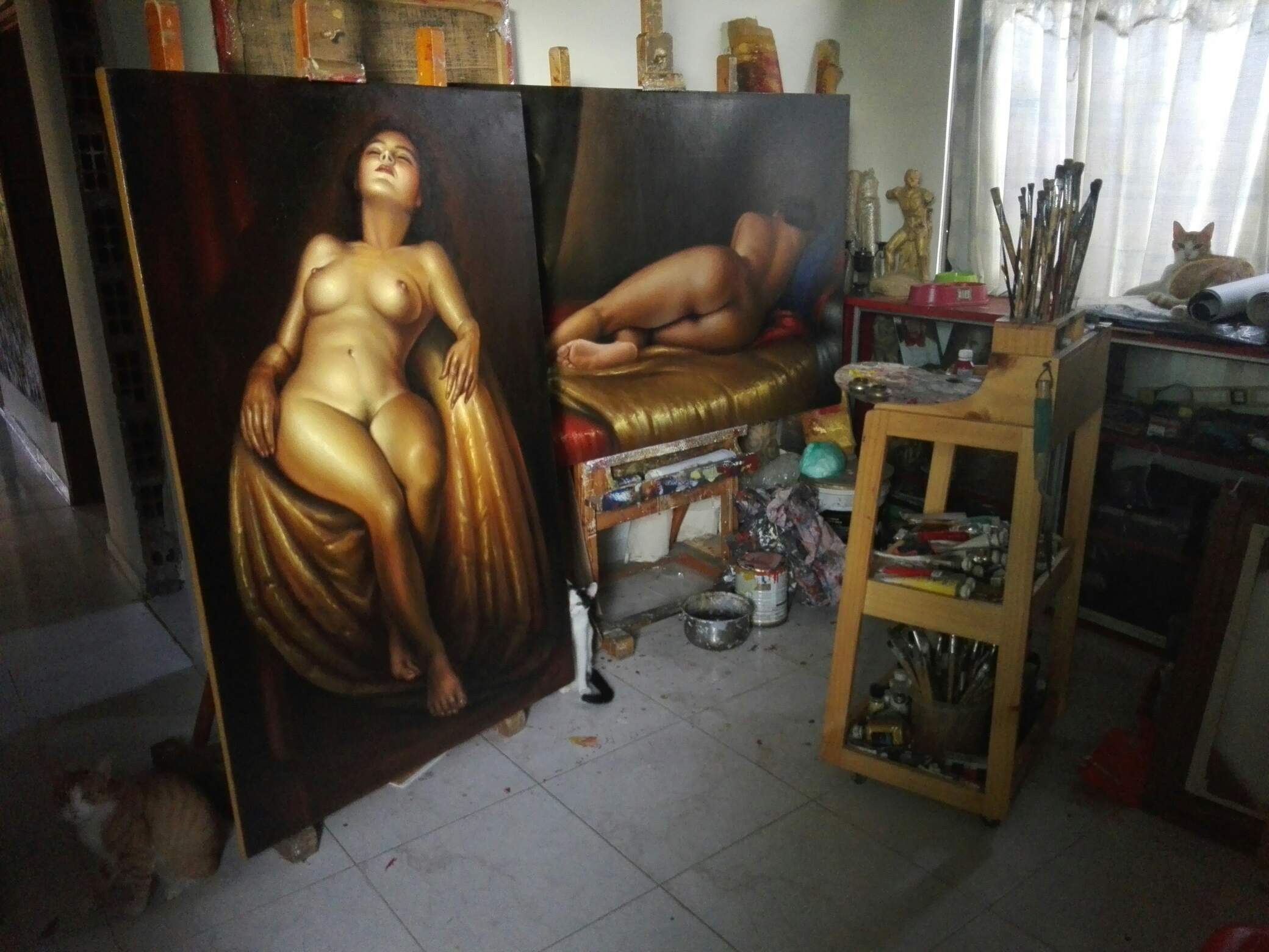 Mi estudio el viernes 31 de mayo 2019. 5. 30 pm, en compañía de Tigre Chifloco, de Chumillo XVI y de Nefertiti Kalocha, junto a nuevas versiones de «AMÉRICA MESTIZA» y LAXITUD» dos desnudos al óleo sobre lienzo del año 2017.