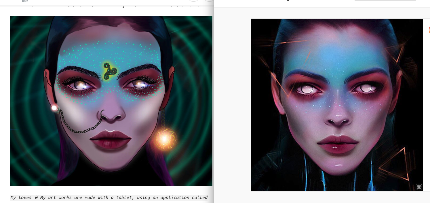 Hi @juliakponsford, I respect your opinion on this case very much and will DM you the other examples for us to discuss? I never make claims without their being quite a bit of proof, yes if she would have sourced or explained rather than saying they are 100% here original works... that would have been acceptable in my eyes. This was reviewed by multiple people before coming to this conclusion and as far as the text about her friend sent her an image that she edited... well, maybe we all missed that... but would be curious what has been edited recently as well. If you feel we are wrong in our assessment here, then I will definitely reconsider. I’ll DM you what I have. Thank you.