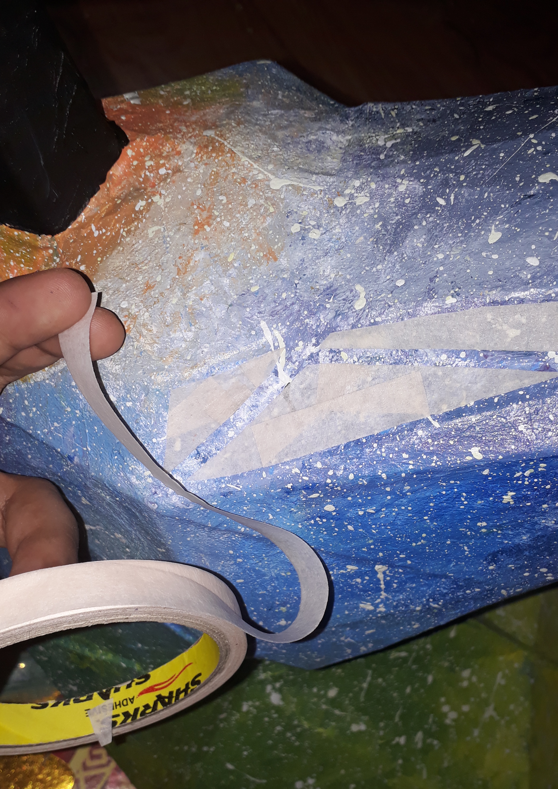 Then I started to connect the shaped that I cutted earlier using some masking tapes and at the same time I started to paper mache to make it more steady.