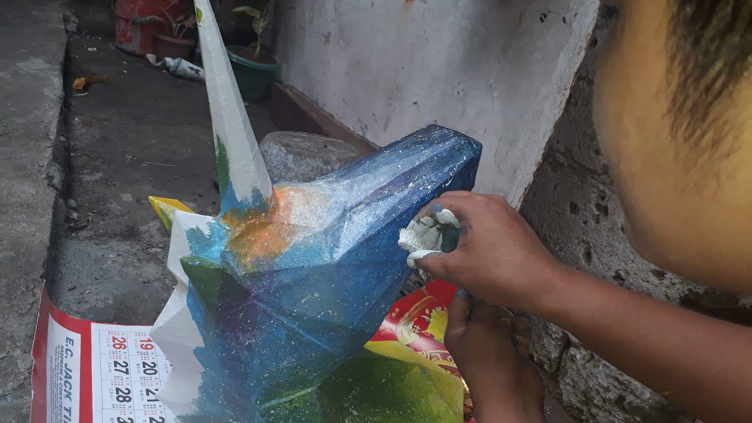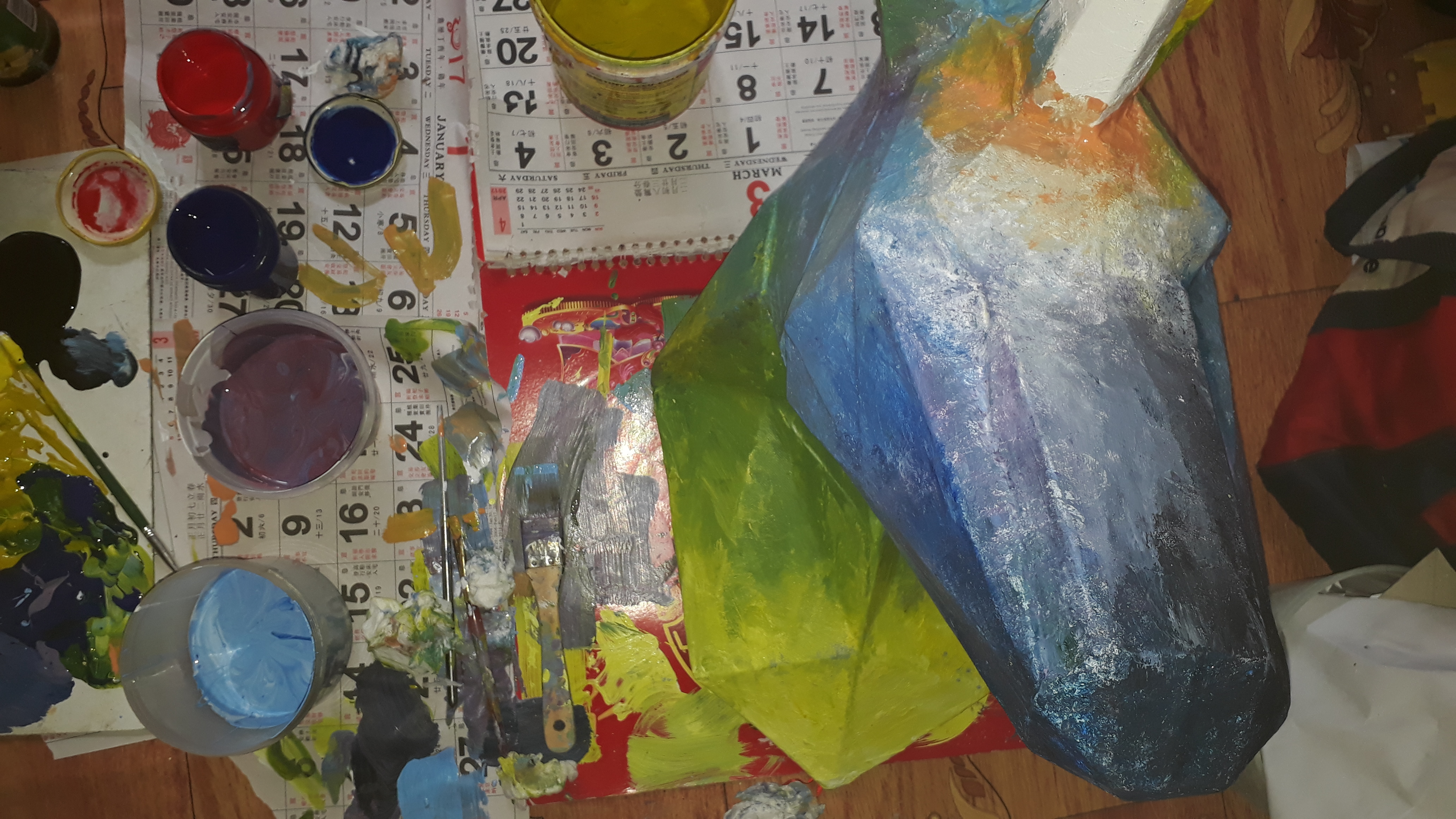 Then I started painting it using *blue, red, yellow and white acrylics*. I mixed the red and blue to make violet, blue and yellow for green and white and each color to lighten the saturation of the color. I used a cotton to blend the colors to the subject. I painted it starting from the nose with black to blue and slowly lighten the color to its neck with color yellow. You can add some a bit of color like I did to the bottom of its horn, I put orange.