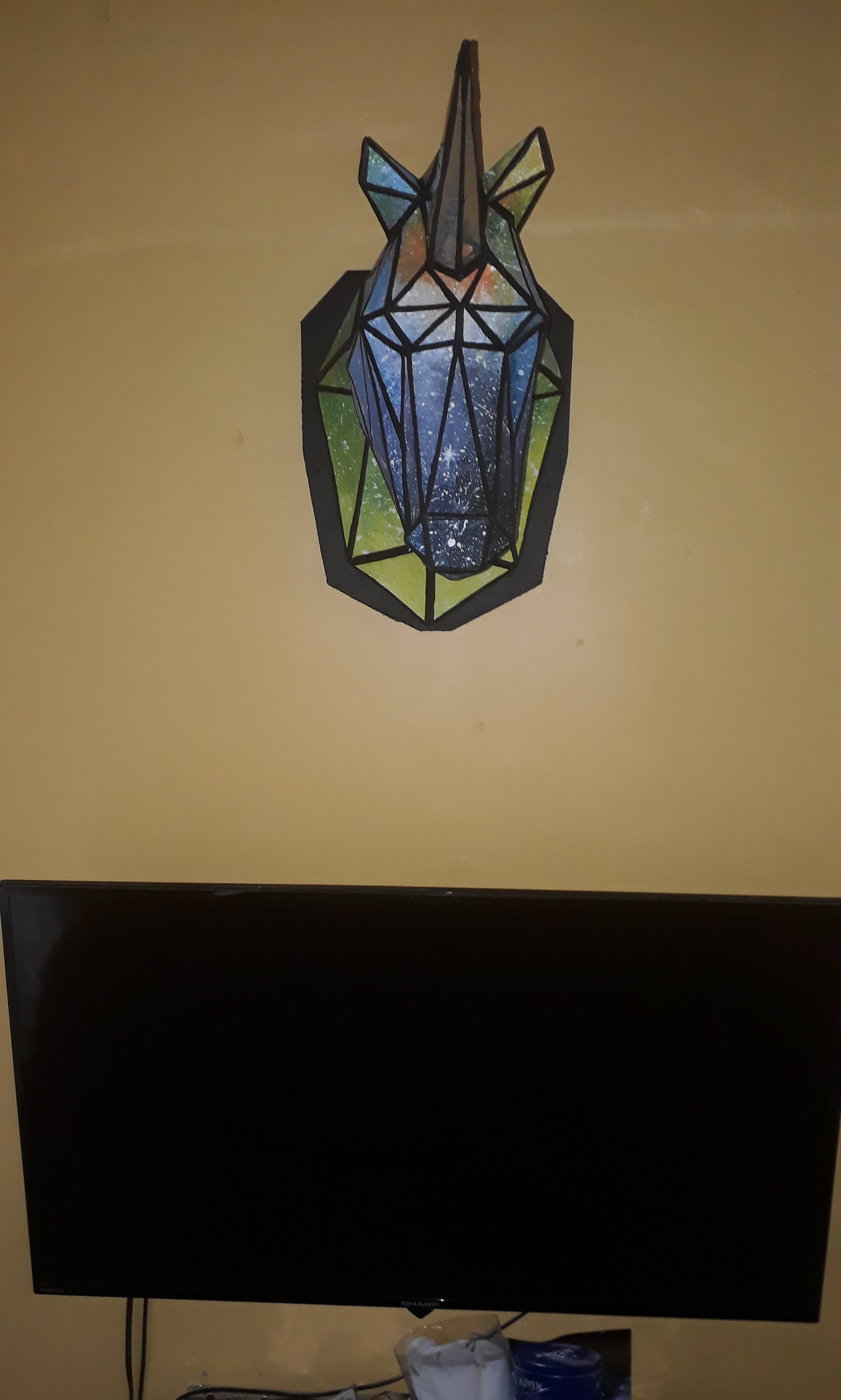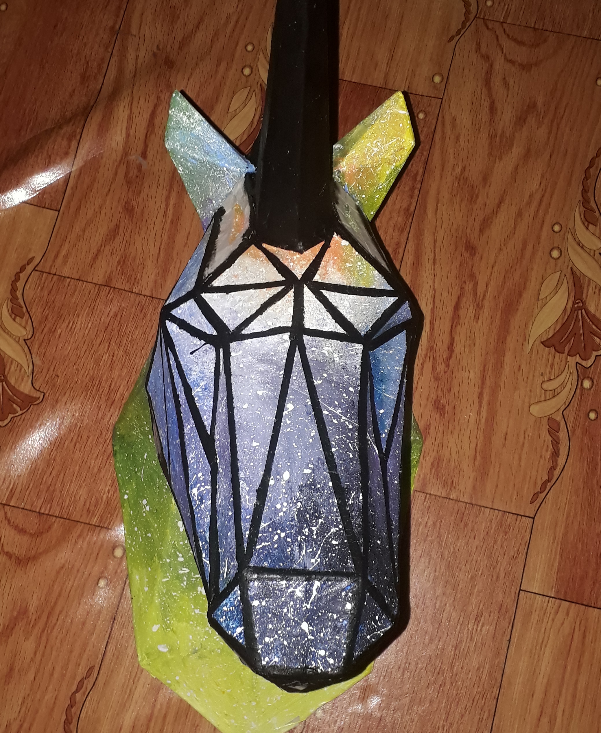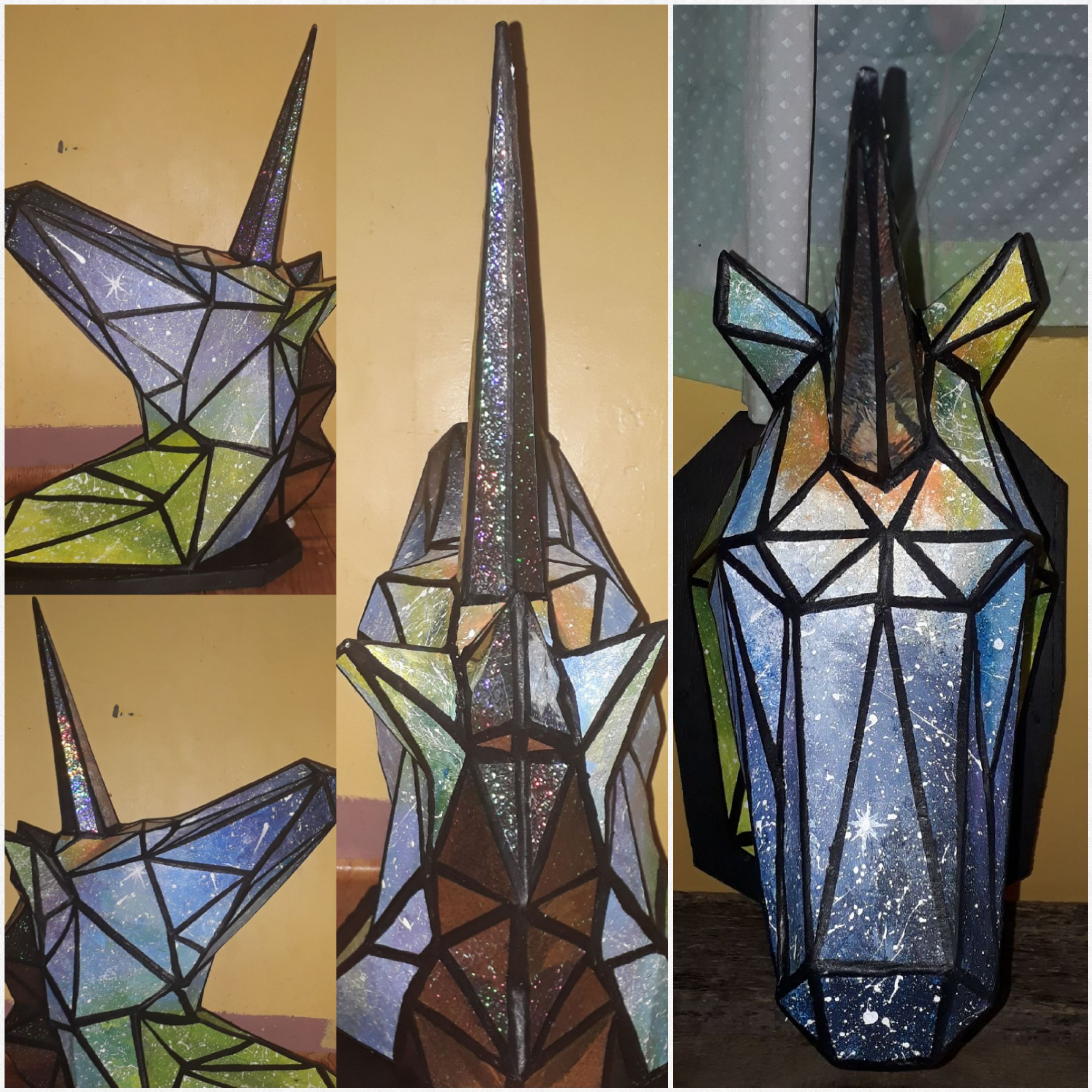 This art is a expression of the myth of unicorn. Its a hunter's animal head trophy it is a mythical animal. This is a paper mache of diamond-galaxy unicorn.