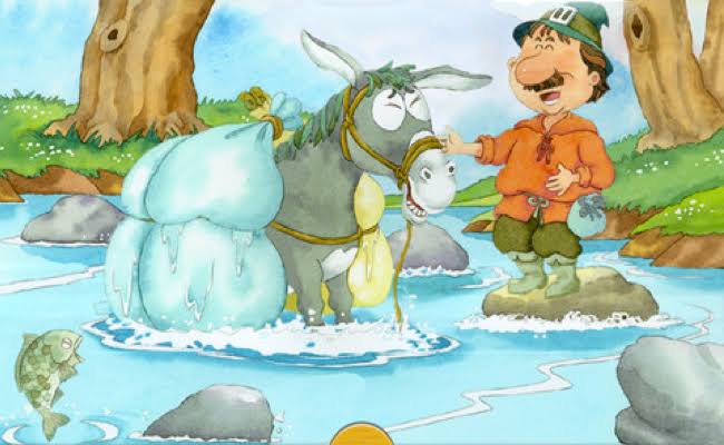 The duo set out on their trip to the market a third time. On reaching the river, the donkey very cleverly fell into the water again. But now, instead of the load becoming lighter, it became heavier.