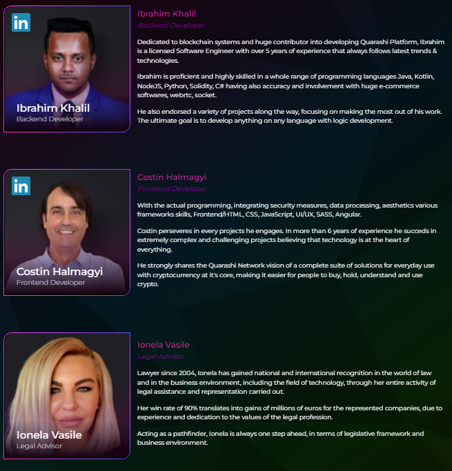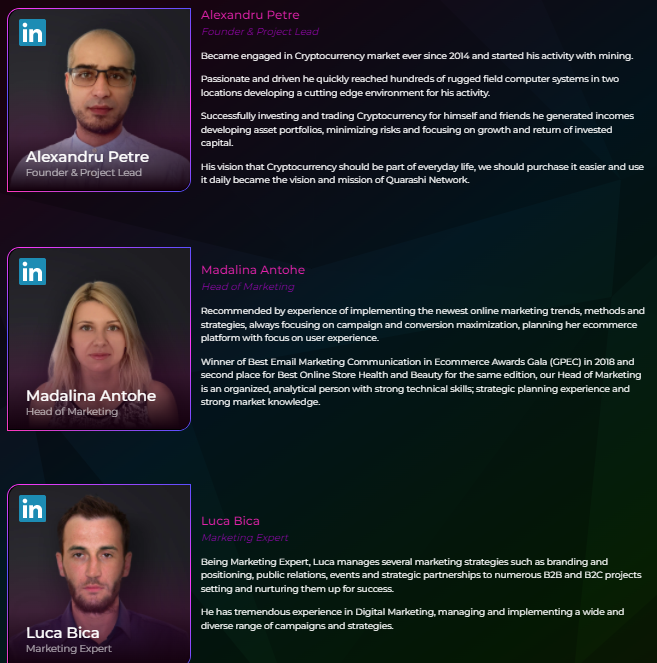 The team is made up of a group of professionals which span across different segments of the cryptocurrency industry. Experts such as Blockchain engineers, Chief Operating Officer, Chief Technical Officer, Cryptocurrency Journalists and other relevant professionals needed to make the Quarashi project a huge success. Again, these experts originate from various countries of the Asian continent. It is also important to note that the Quarashi project is a community project since the team listens to the opinion to their community members and implement them if need be.