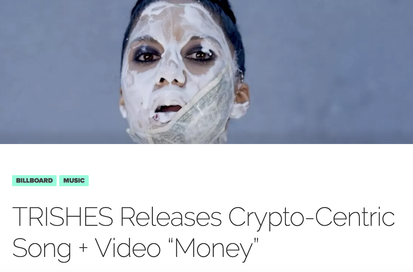 Article Description: Billboard articles are brief updates and news stories that cover creative developments across the blockchain industry. This article reports TRISHES' latest song titled Money which gives a crypto shout out.