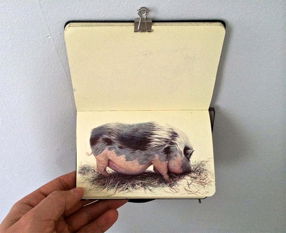 The artist fills in full drawing books with art inspired by his surroundings painted with very precise color ink. He paints portraits of family members, scenes of rugged farms and animal objects, as well as very precise drawings that look like photographs of places and people of his memories during his stay in China and the Dominican Republic. Sanchez often explores the roots of his personal identity in his art through his dual culture, which extends from the Midwest to the history of his family in the Mexican countryside.