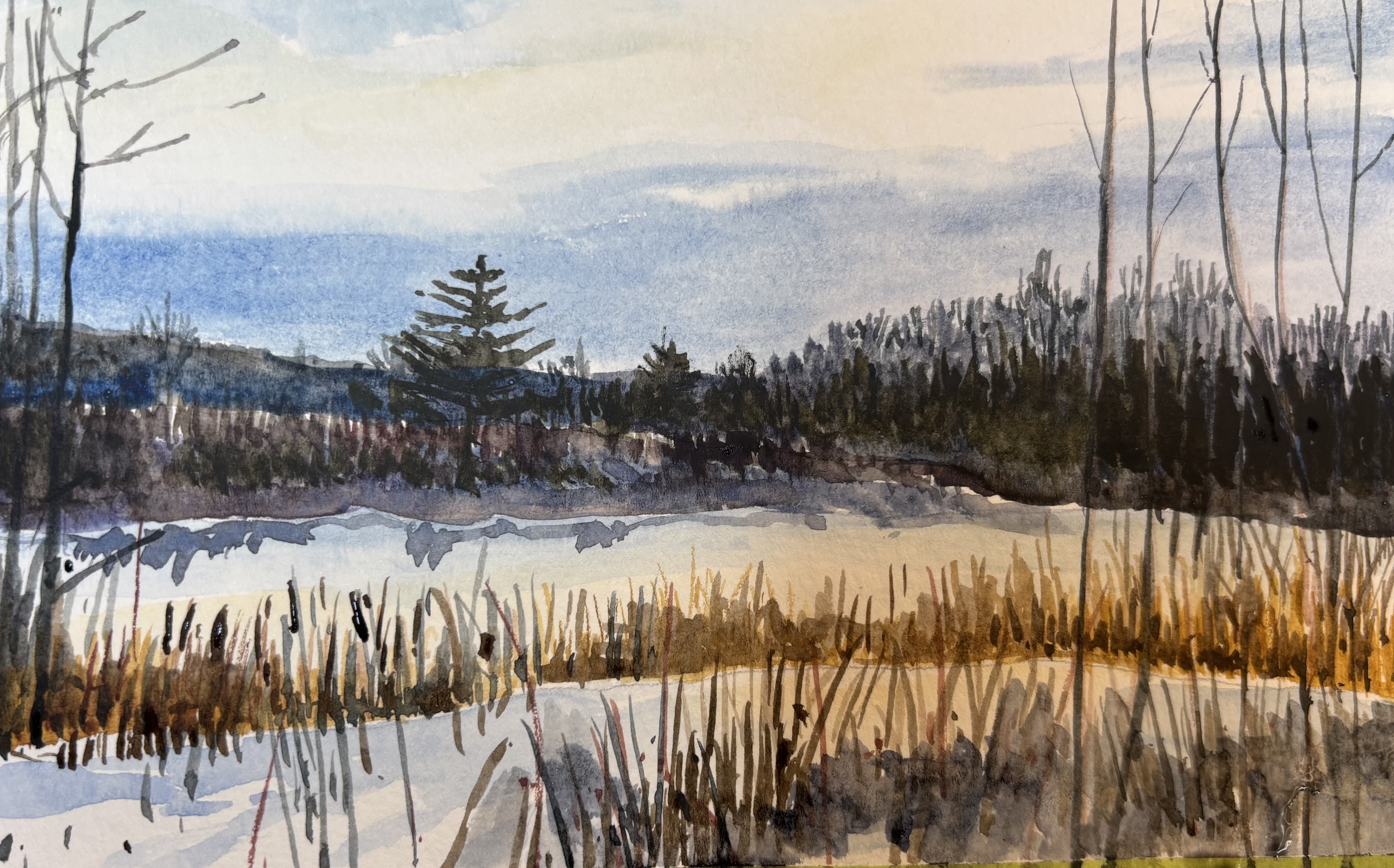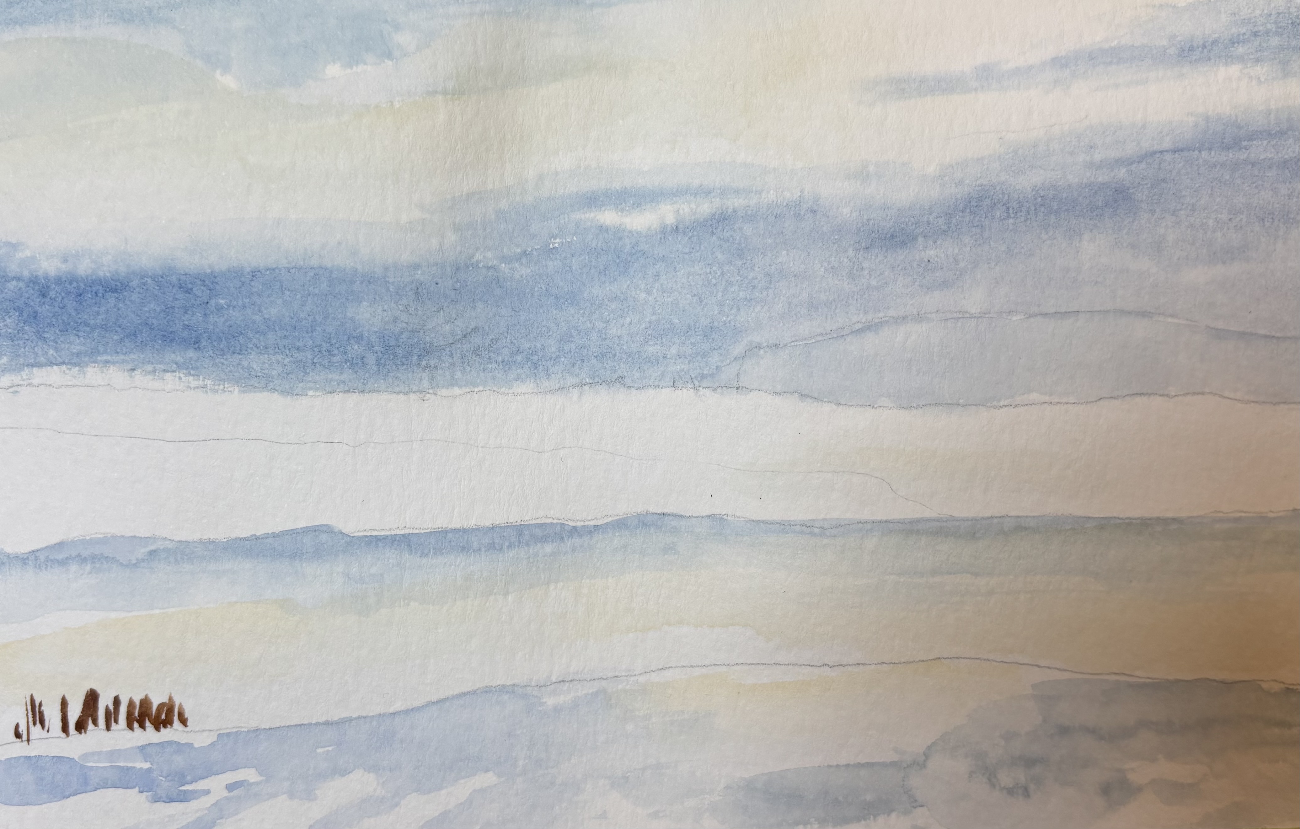 Step One : Start with a very quick pencil sketch to place the tree line, River Edge and shore in the foreground … wet the entire page and then add a light wash of cobalt blue for the sky and shadows on snow. Add a very light wash of new gamboge yellow to the sky and snow.