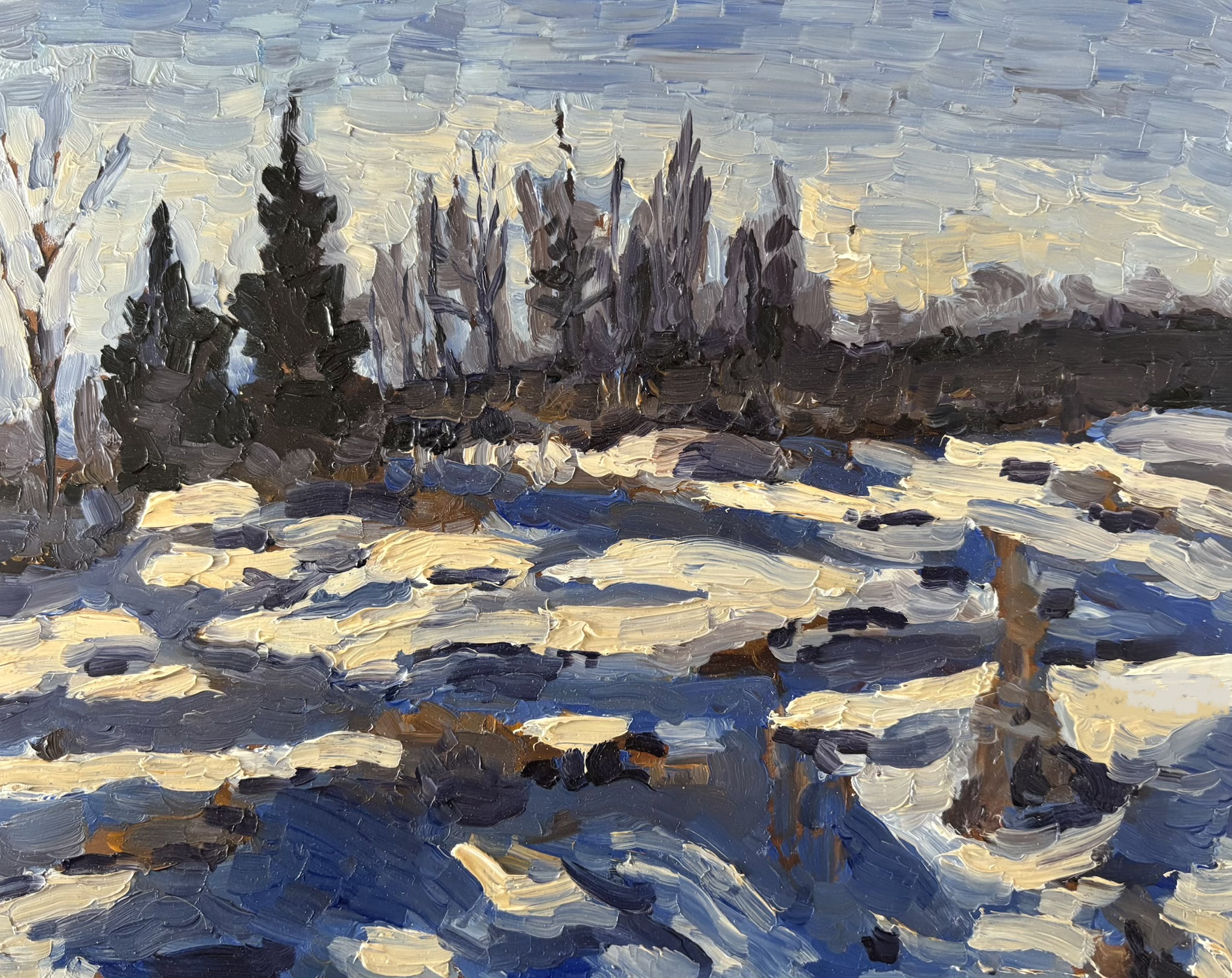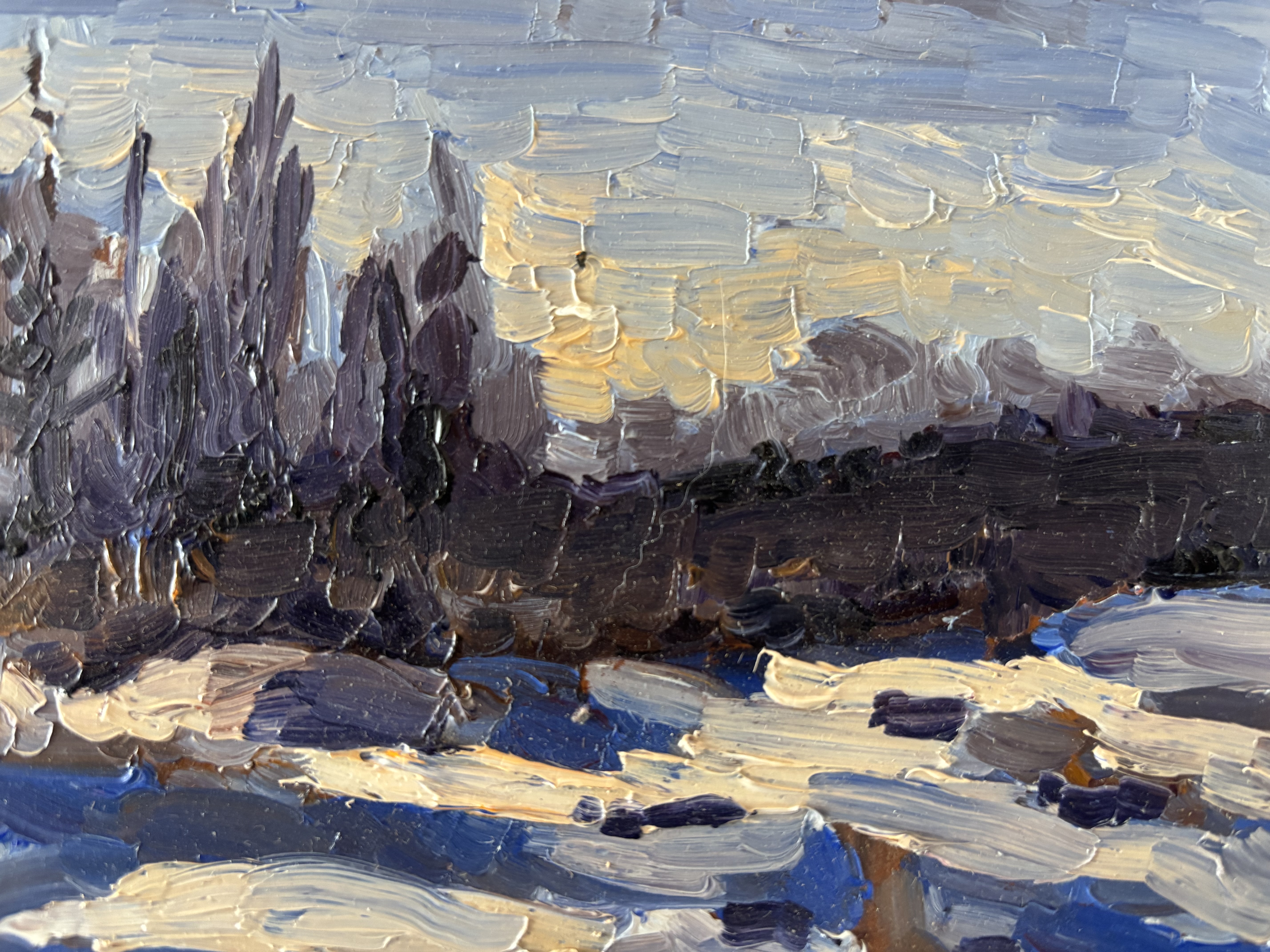 This is an oil painting I made from Cedar Creek where we play hockey in the winter.