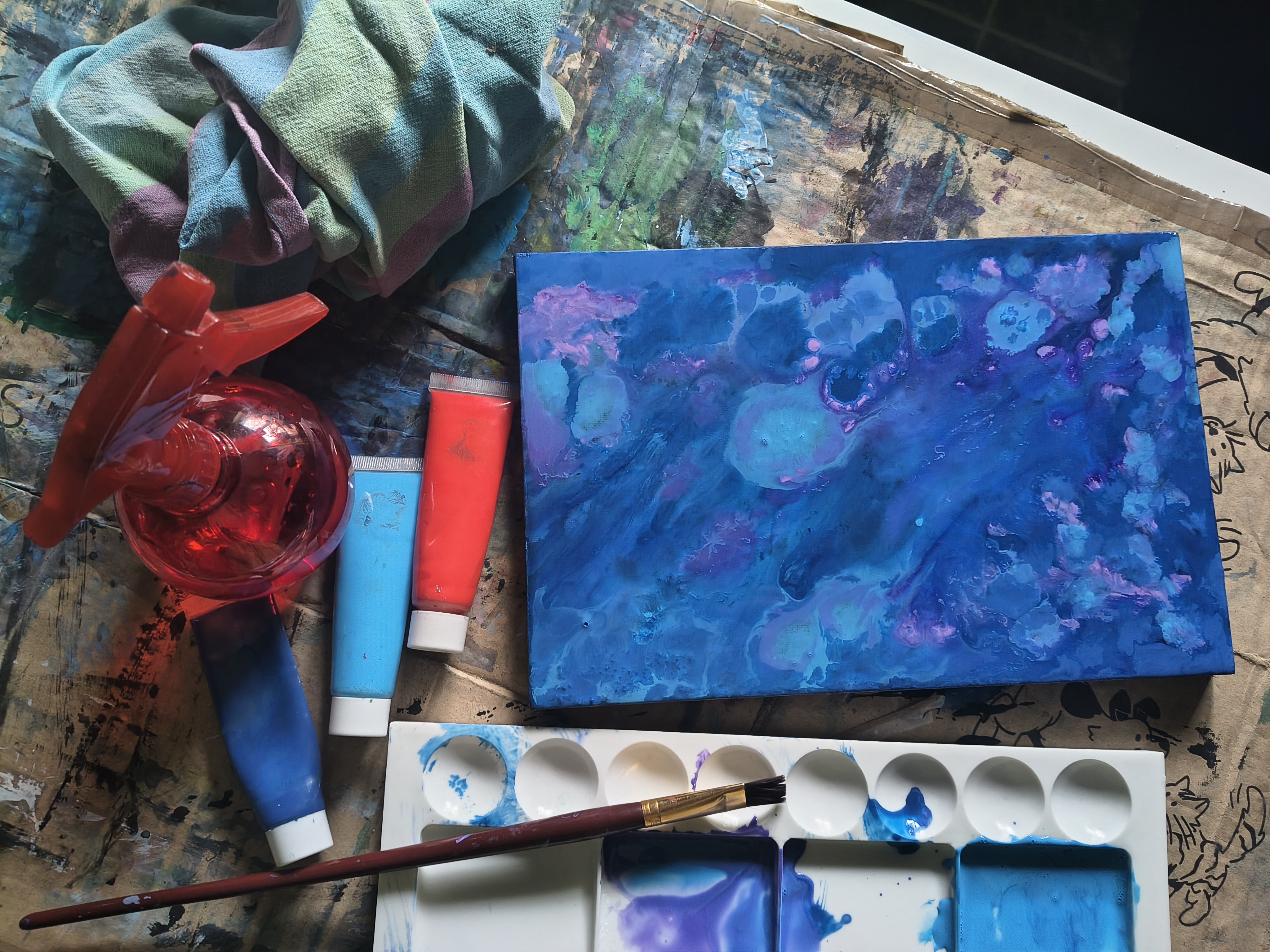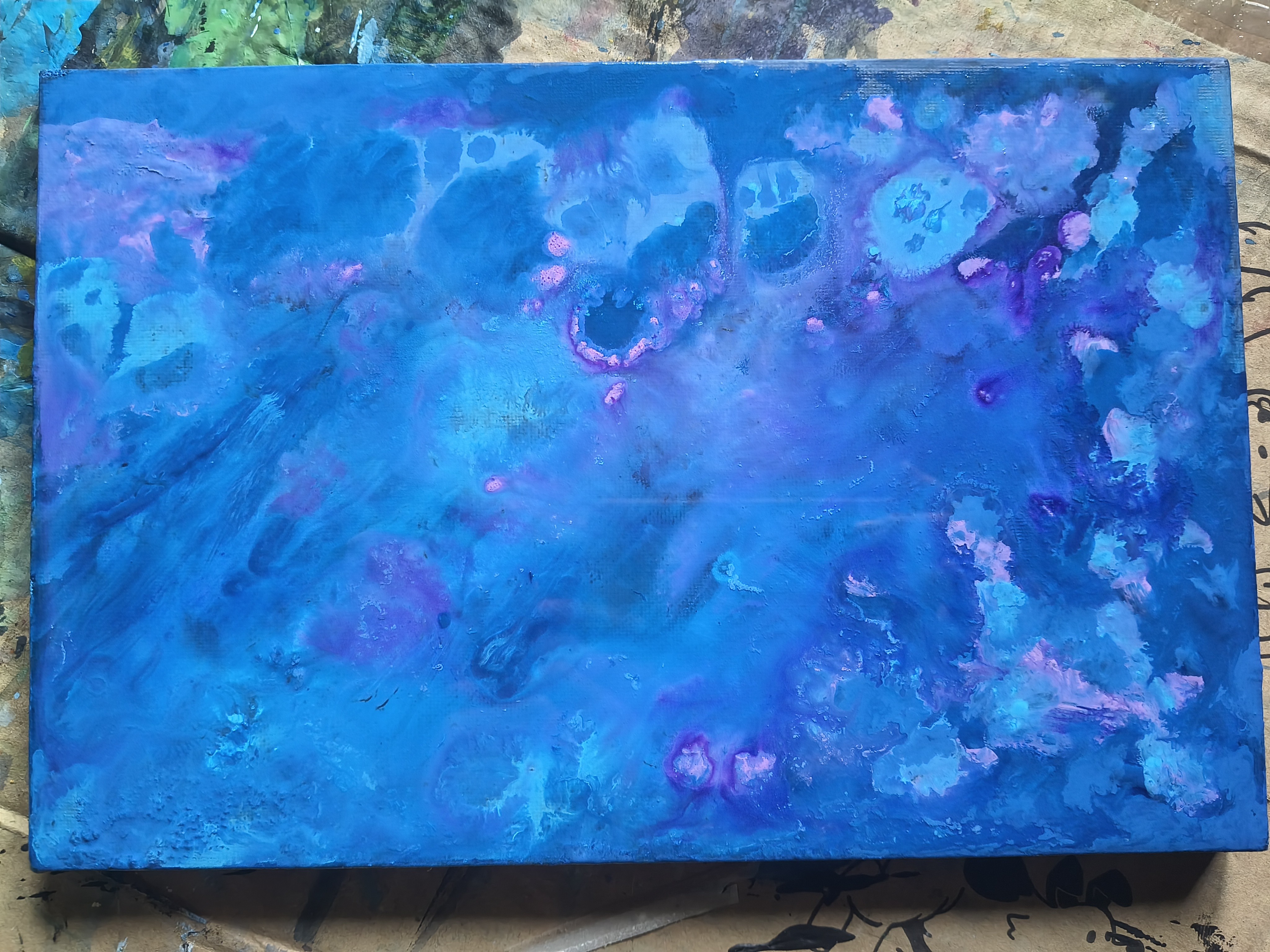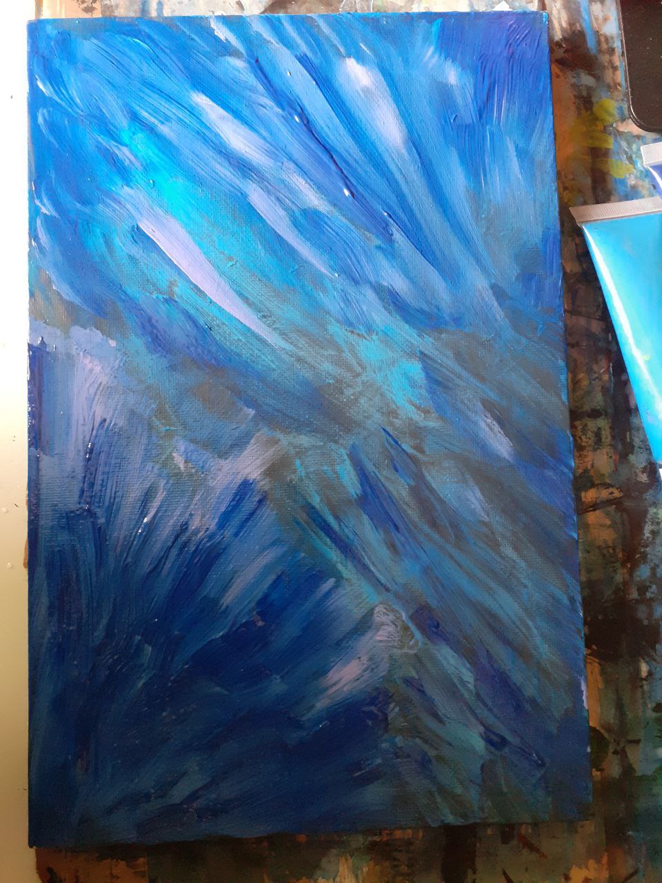 And indeed, everything started off badly, with leftover old paint whose brand I don't know, because there's nothing written on the tubes, and a reused canvas. Here and there, I also had to remove thick clumps of paint from the canvas and pull a hair out of it.