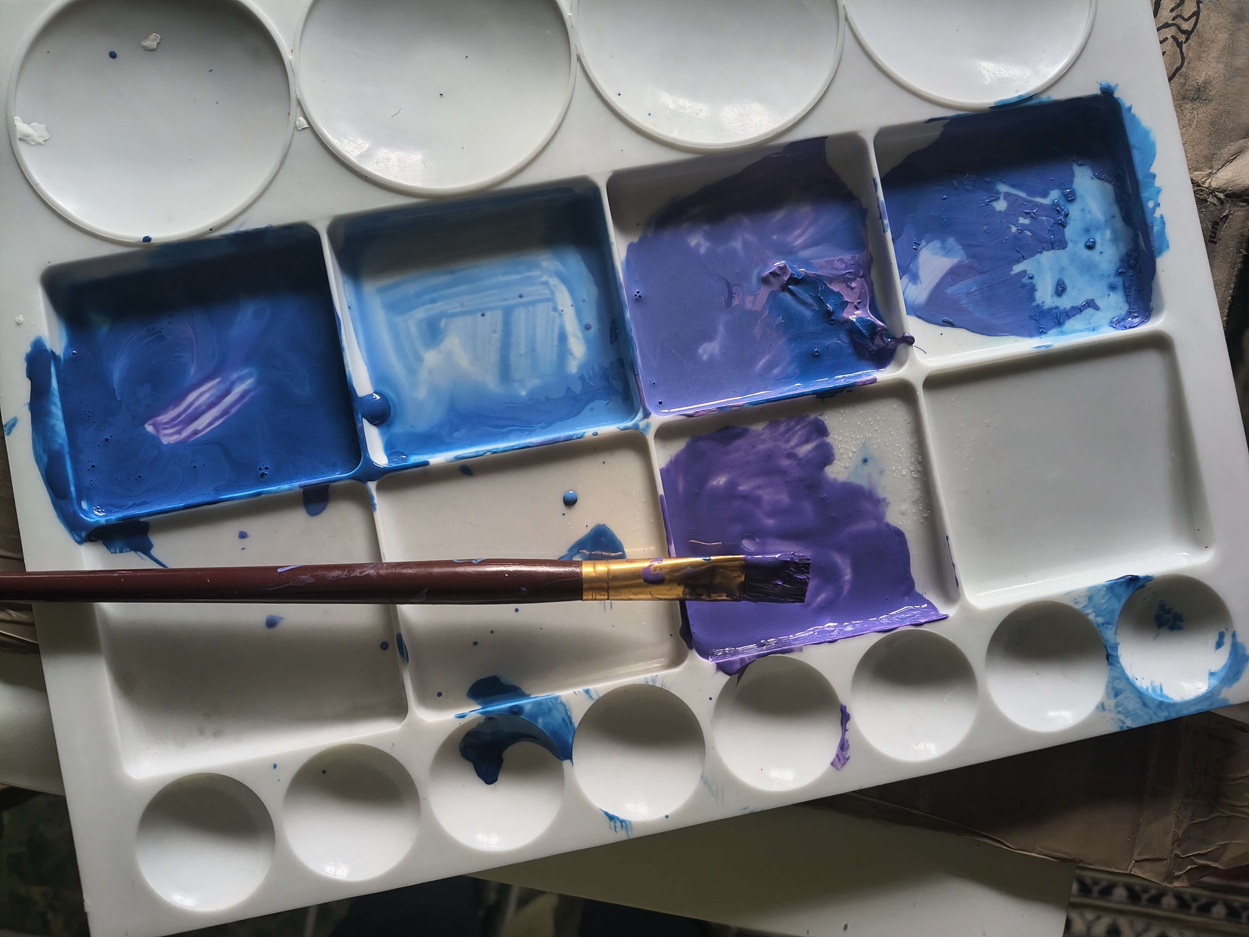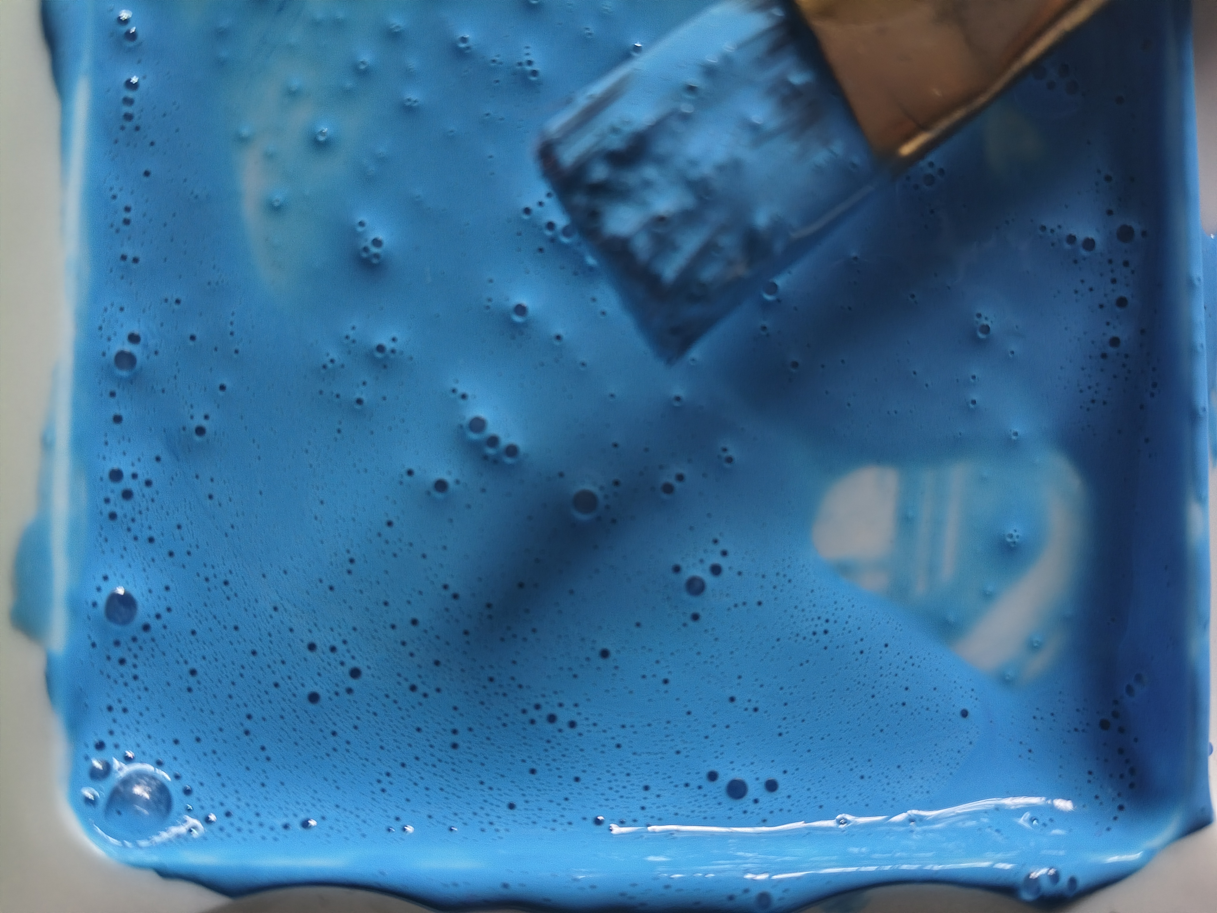 The air bubbles (see the blue paint on the palette in the 3rd photo above) form in the paint when I dilute it with water. This also happens when you make your own paint for the pouring paint technique. If you want to get rid of the air bubbles, you can carefully pierce them with the bristles of the brush.