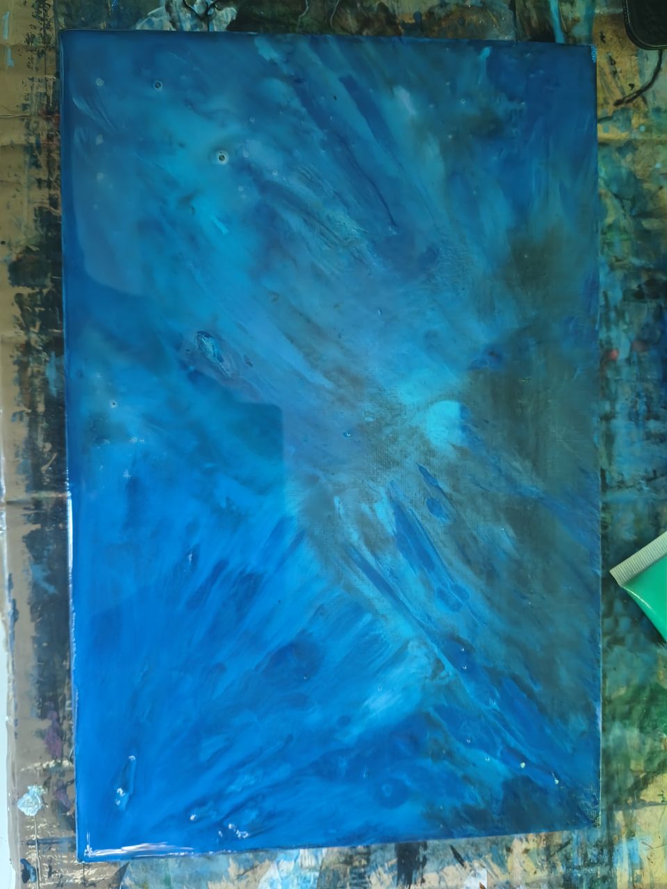 It's not dry yet, but this is the result so far. It took quite some time to apply the first layer. It didn't turn out the way I had imagined, but it was an interesting experiment. Contrary to what you might think, this is not the result of pouring paint, but the result of spraying water on one side before starting, applying acrylic paint with water and then spraying water on the painted side again. Incidentally, this was the only thing I could make of it because when I started, my canvas was, of course, much too wet and it was difficult to apply paint with a brush. Let's say the result wasn't really pretty.