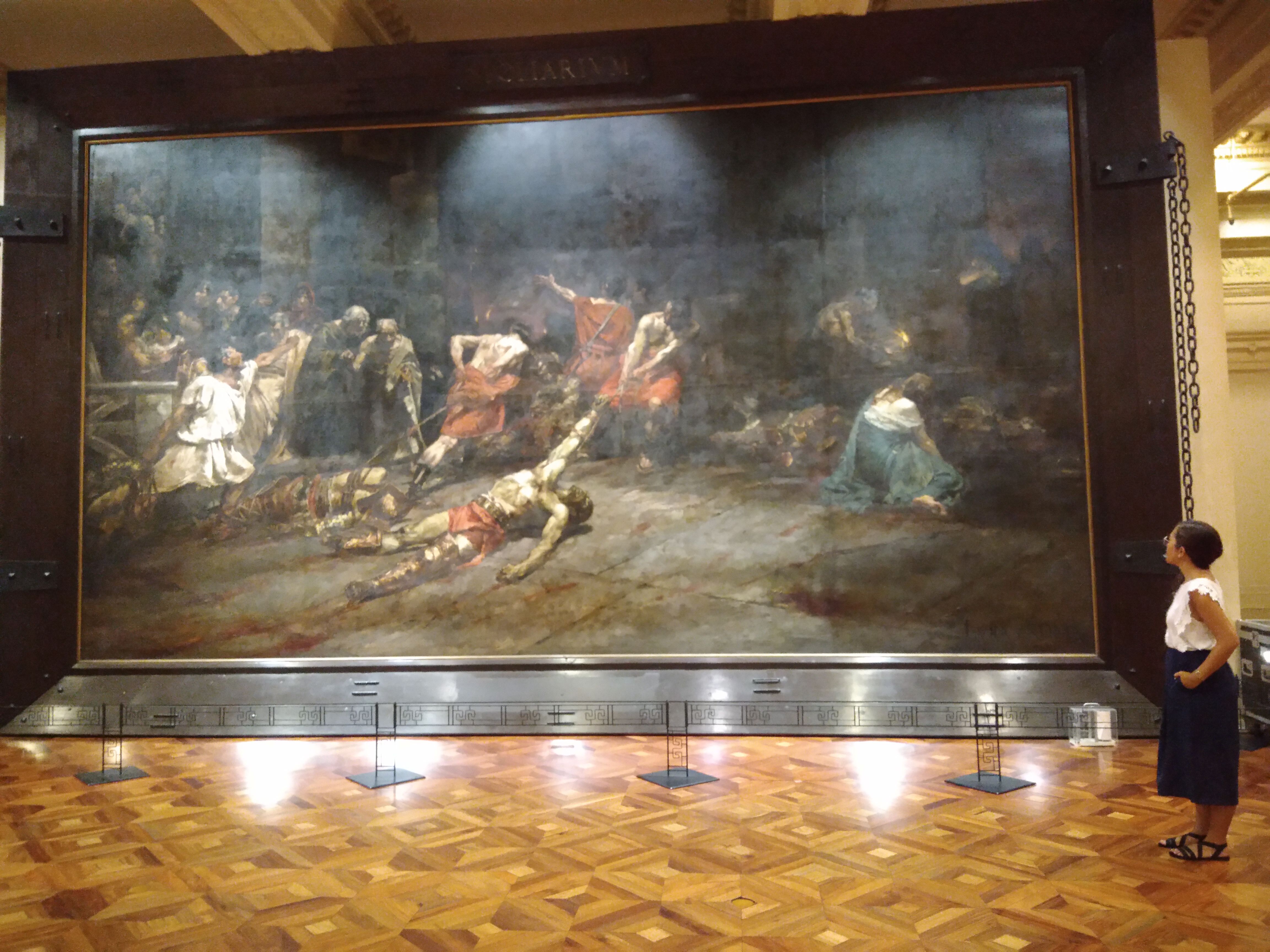 Back in 1844, the painting was submitted by Luna to the Exposición Nacional de Bellas Artes where it garnered the first gold medal. Then now it was the first painting who will greet the guests as they enter the first floor of the National Museum. Its medium is oil on canvass with the dimensions of 422 cm × 767.5 cm. This painting as you can see depicts dying gladiators.