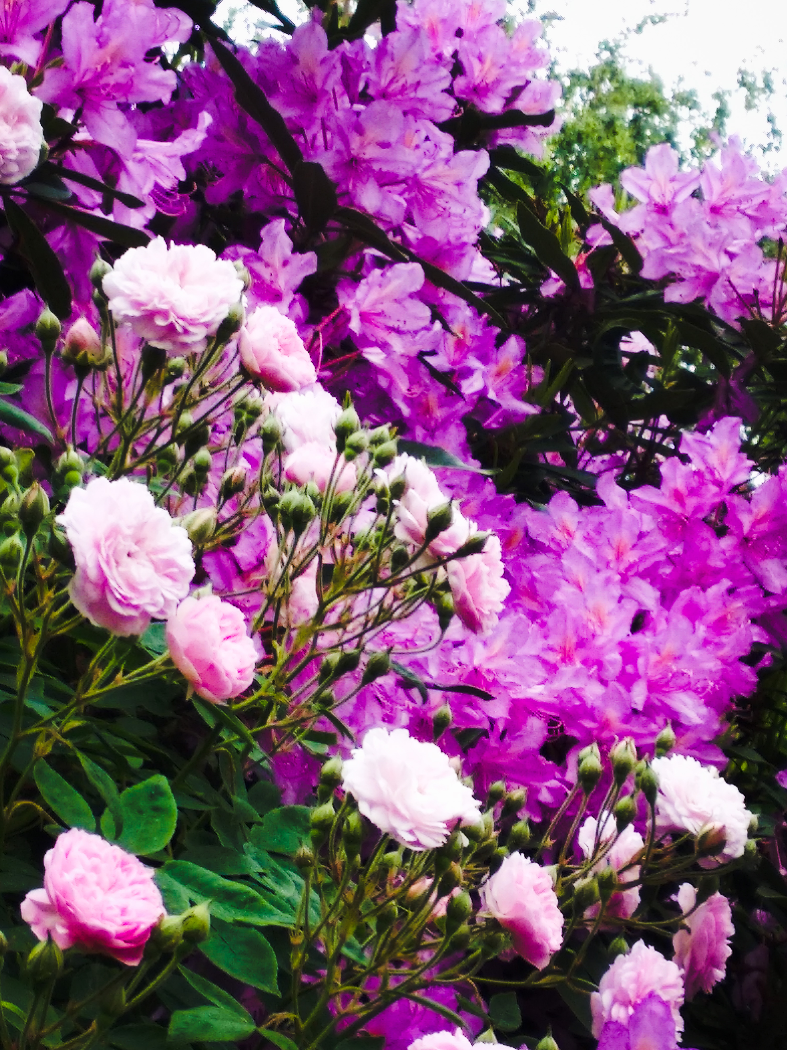 Еще мне у него нравится цветочный кустарник сиреневых цветов, которые переплетаются ветками с розами.