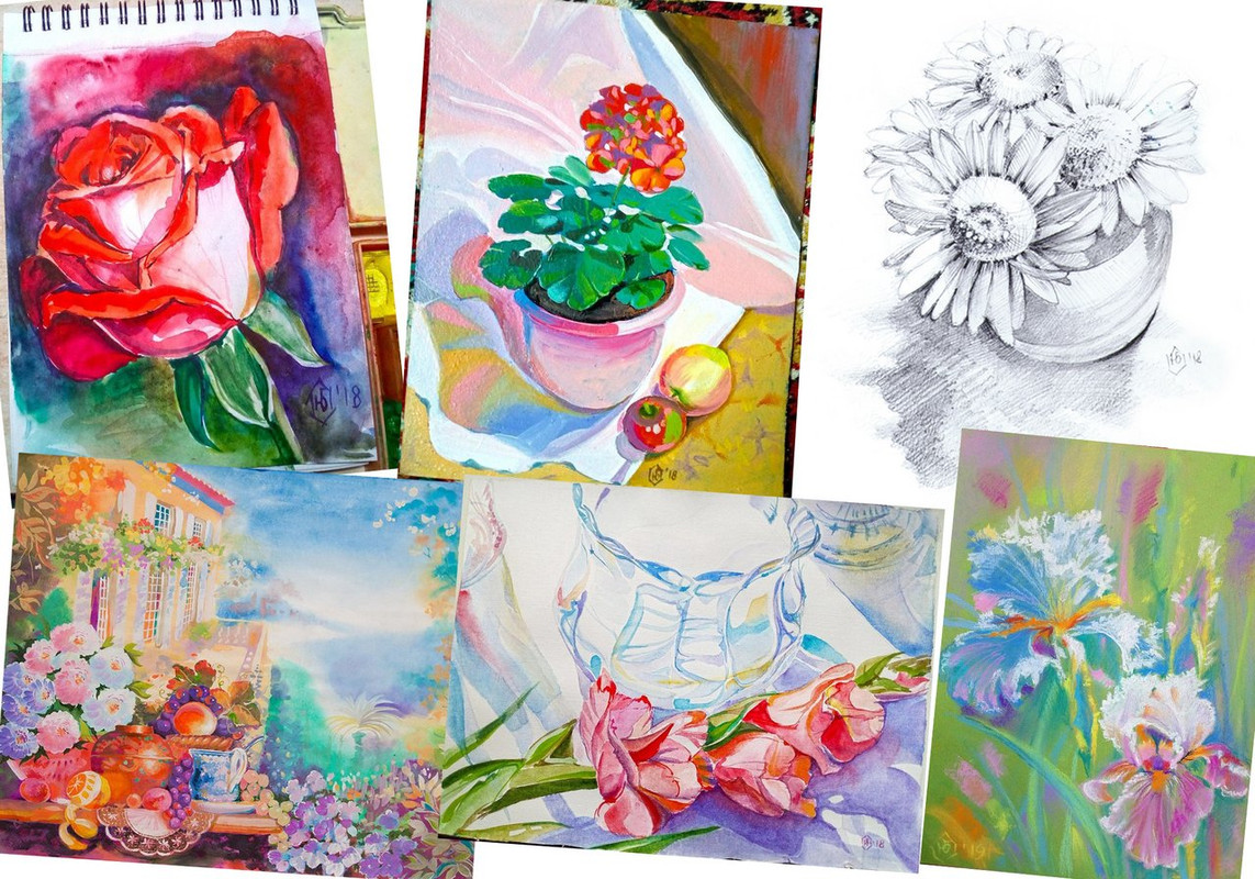 Recently, while communicating in the comments, one of the readers of my blog asked if I had ever painted flowers. I was thinking, because I periodically draw different plants. And so, after searching in the archives, I was surprised to find that I have quite a lot of such drawings and paintings. Today I am publishing some of them. Most of the works are watercolors, but there are graphic drawings, gouache works and even one still life painted in oil. Some works have already flashed in my feed, but now they have come together to please your eyes.