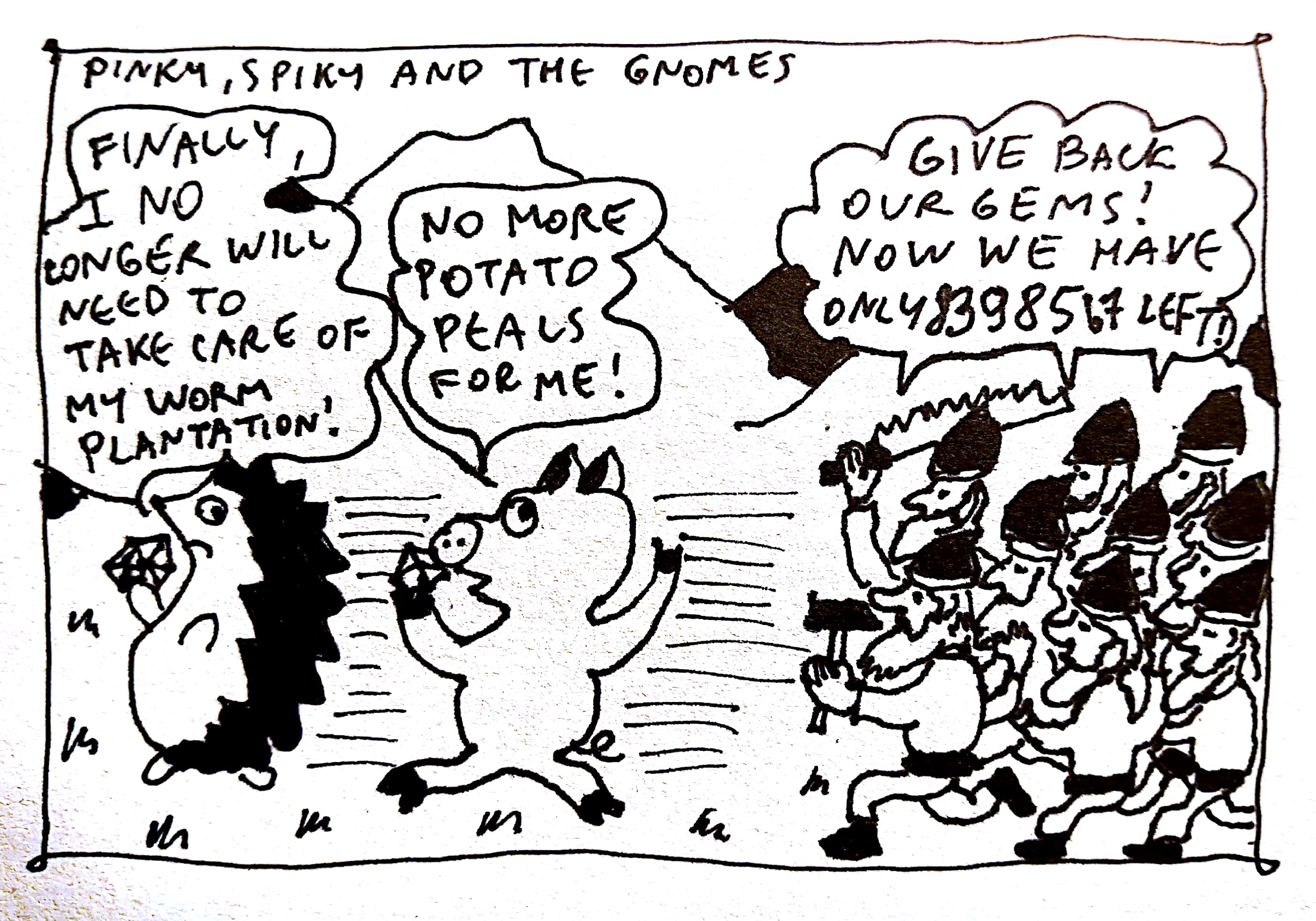 Oh no! They took the gnomes special gems, It’s a lynch mob! Run Pinky and Spiky, and throw down those gemstone 💎 ❣️I like the black and white ink by the way!