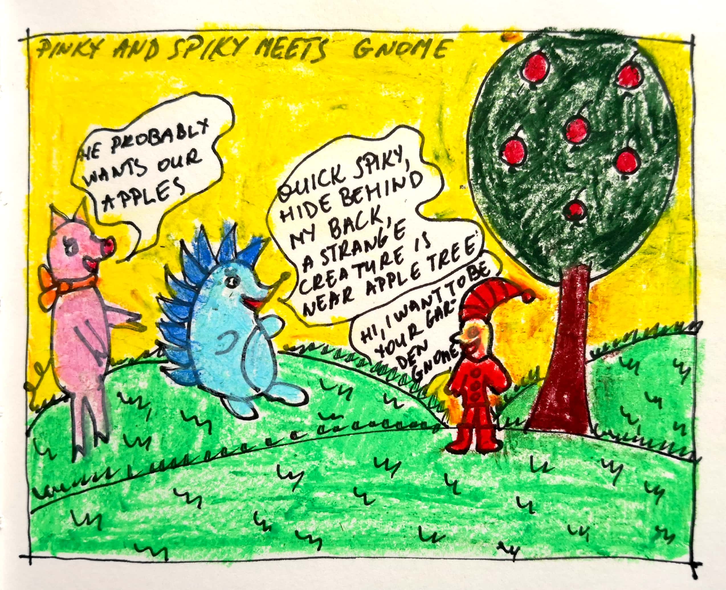 Here is my entry: https://steemit.com/artstorm/@laputis/pinky-and-spiky-meets-gnome-my-entry-for-artstorm-contest-34-day-5-theme-today-gnomes-non-digital-art-category