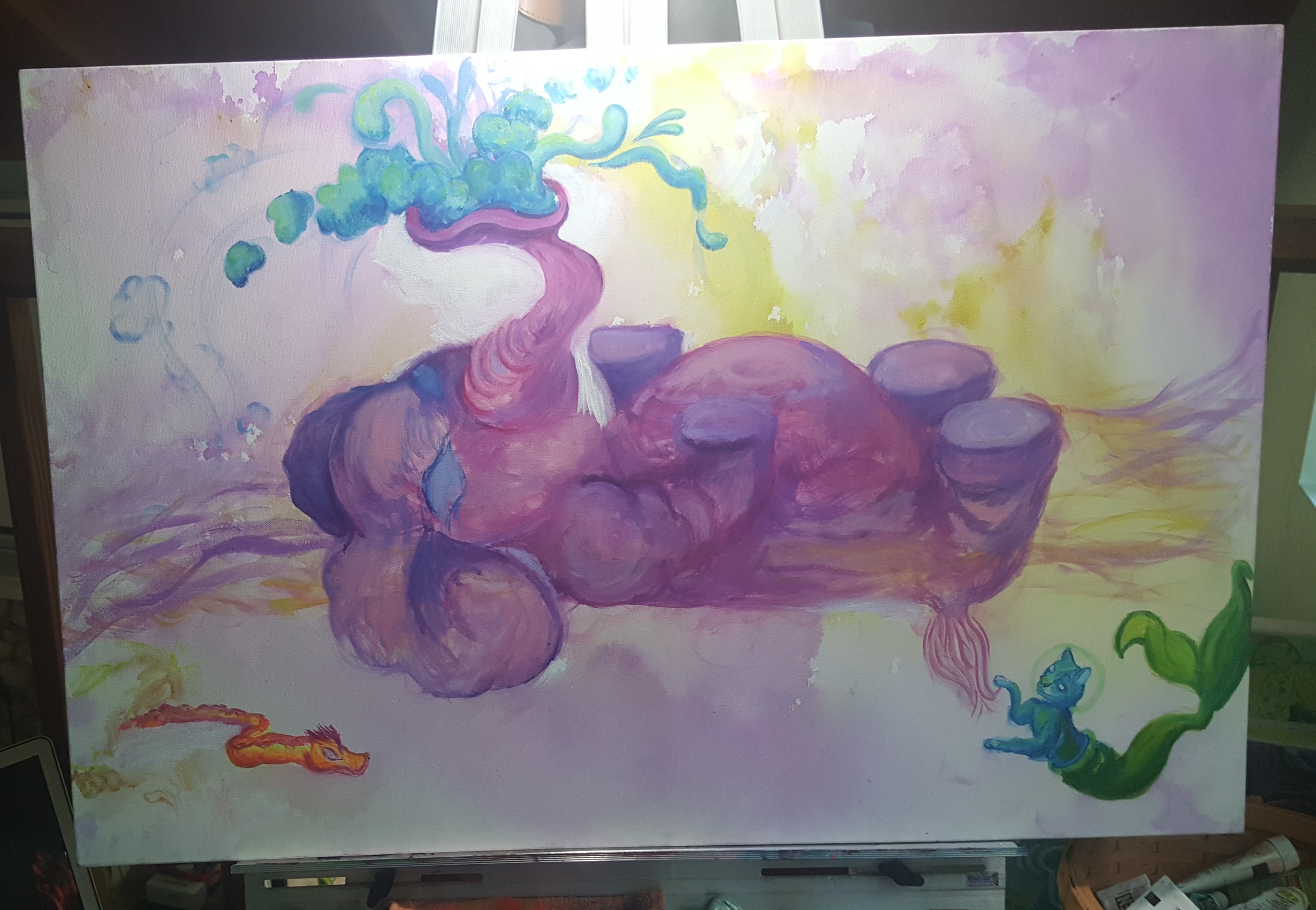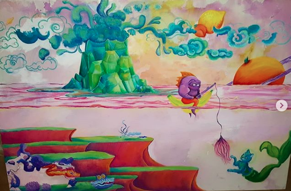 A piece I started last summer of 2018 and finally finished this summer to my delight, a year later, took quite the journey from starting out to its final product. What started as a cloud elephant spouting out the world from his trunk; slowly became the delicious world of fruit-i-verse that you see here today.