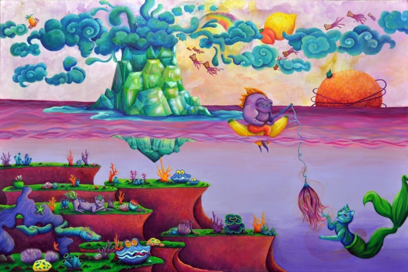 Where fish men ride banana boats while catting for purrr-maids in the Kool-aid Ocean(because you cannot fish, when you ARE a fish!). Peanut Butter Jellyfish ride the water clouds with joy; squishing their jelly tentacles together to get ahead. Orangus shines next to the Lemosun that lights the world. Everyone is joyous with a full belly of laughs.