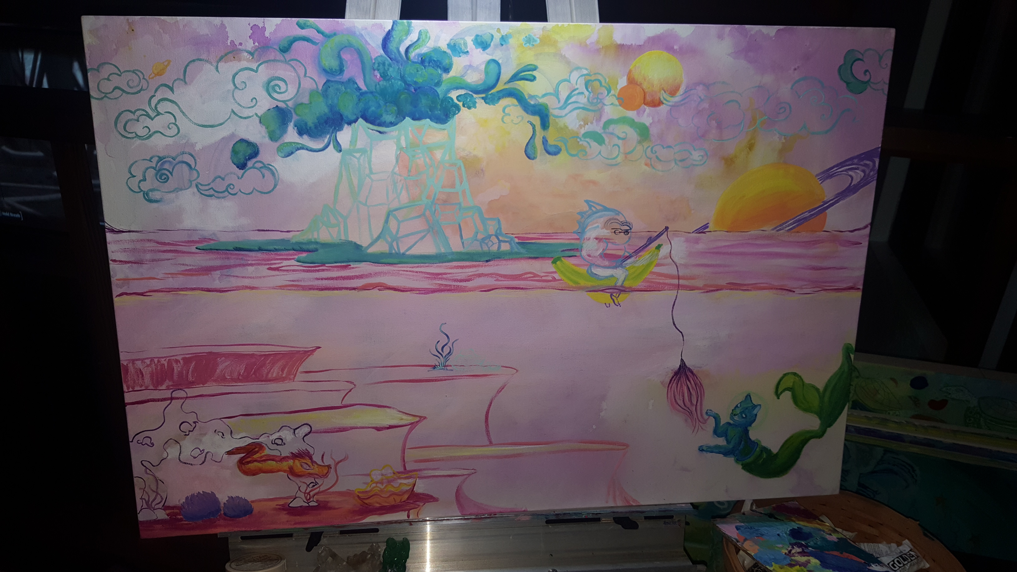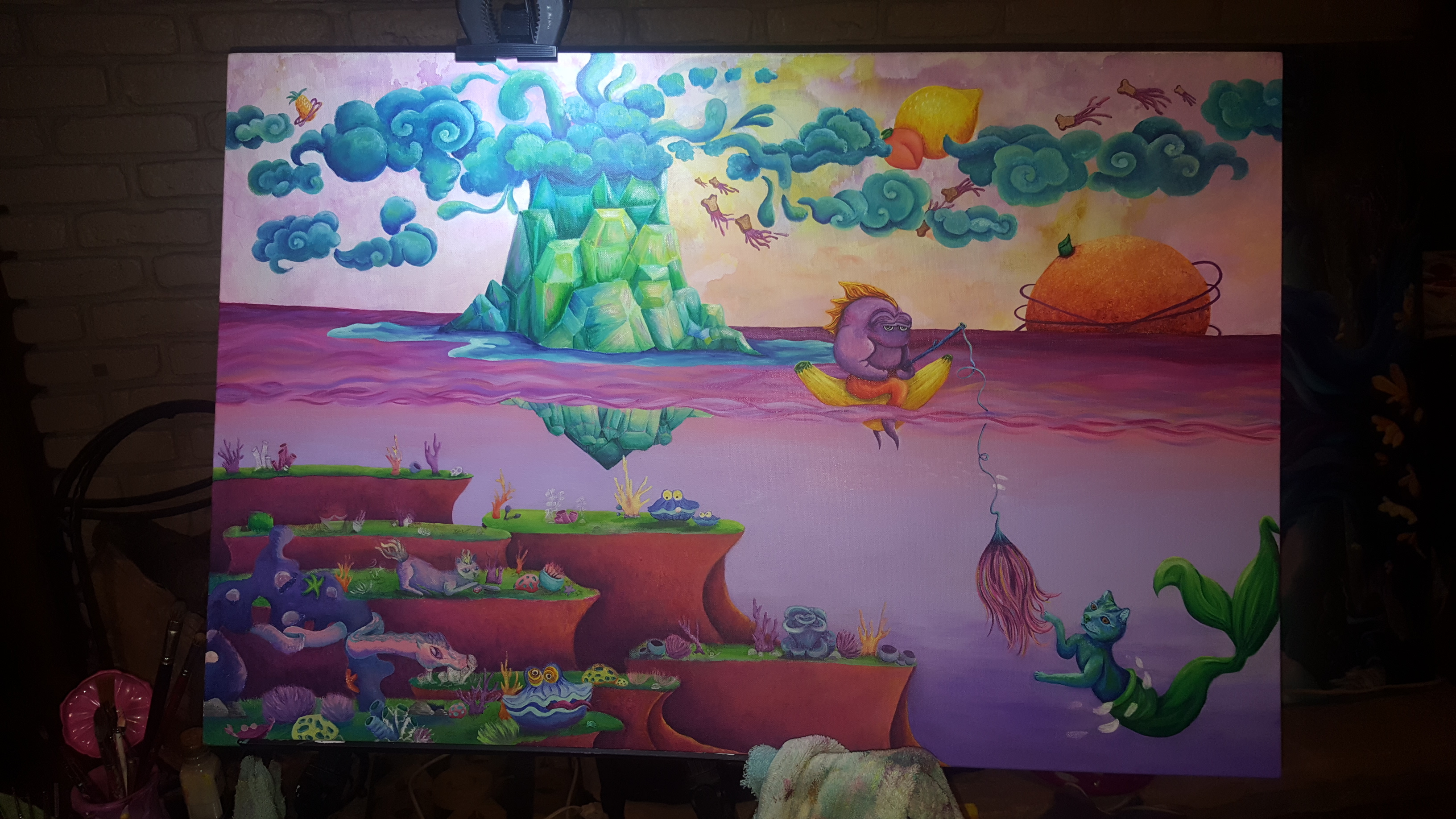 It looks indeed like a fruit world, so surreal and colourful:) The cat mermaid is my favourite detail:)