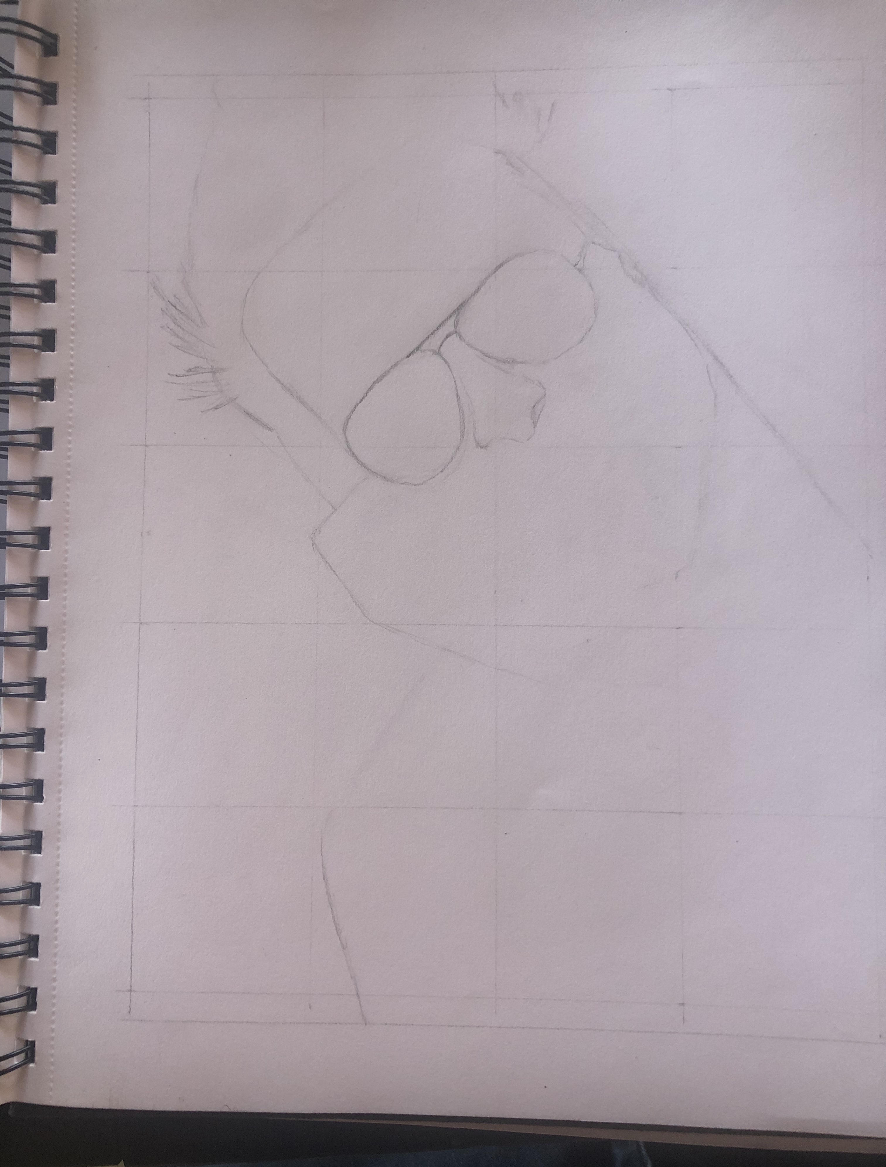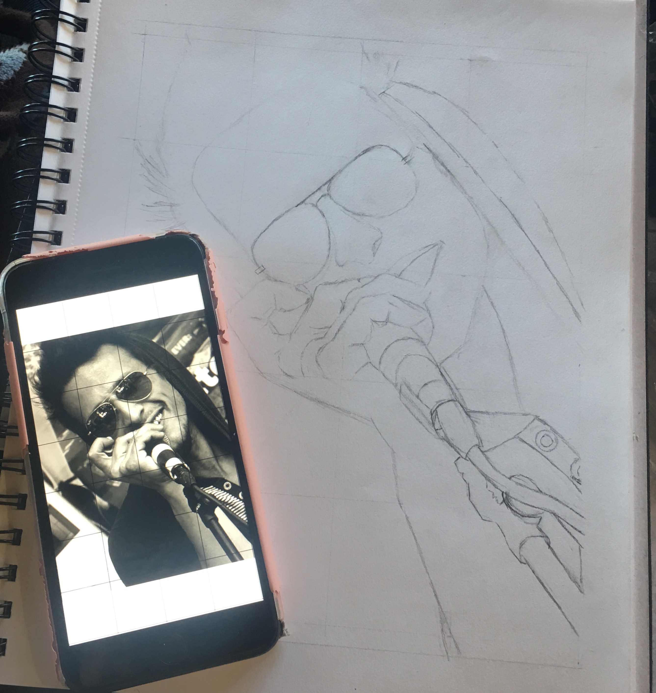 With a No. 2 pencil, a ruler, and a straight edge, I transferred the grid from my phone to the A2 notebook page and drew in all of the outside lines so I could see my bordering space: