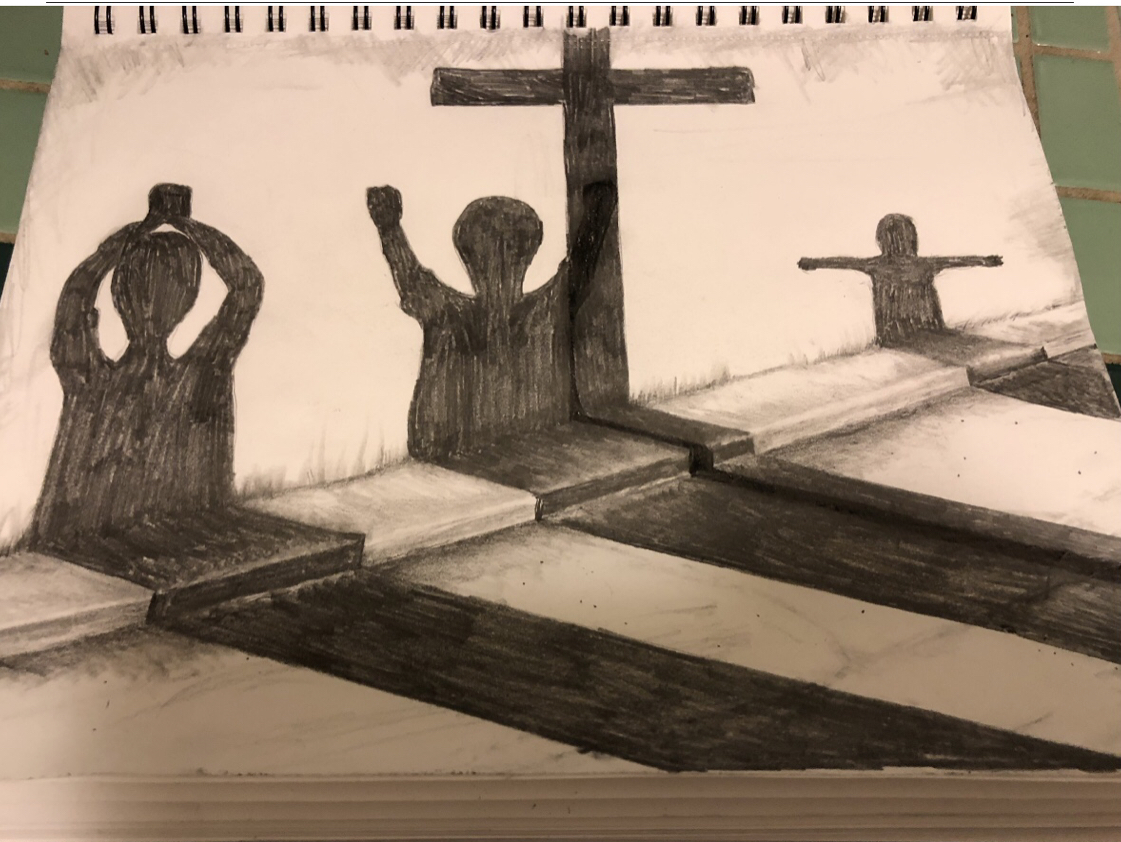 Once my edges are complete, I continue transferring one square at a time, from my phone to my sketchbook page, left to right because I’m right handed and keeping the page clean is a challenge—you want to drag your hand away from your work, not across it. Now there’s a constant prayer going through my head, “God, control my senses.” That alternates with my own confidence reminder—“just draw what you see.” That prayer and my own thought, ‘God, control my senses—just draw what you see. God control my senses—just draw what you see” (repeat) back and forth to myself, and the grid app are my tricks. My techniques are a No. 2 pencil for the majority of the line work, a mechanical pencil for the sharp line work, two different sized paper stumps for blending—3/8” for small blends and 1/2” for the larger ones, a lot of erasing, HB-6B graphite’s for all of the shading and a white gel pen for repairs, texture and highlight details.