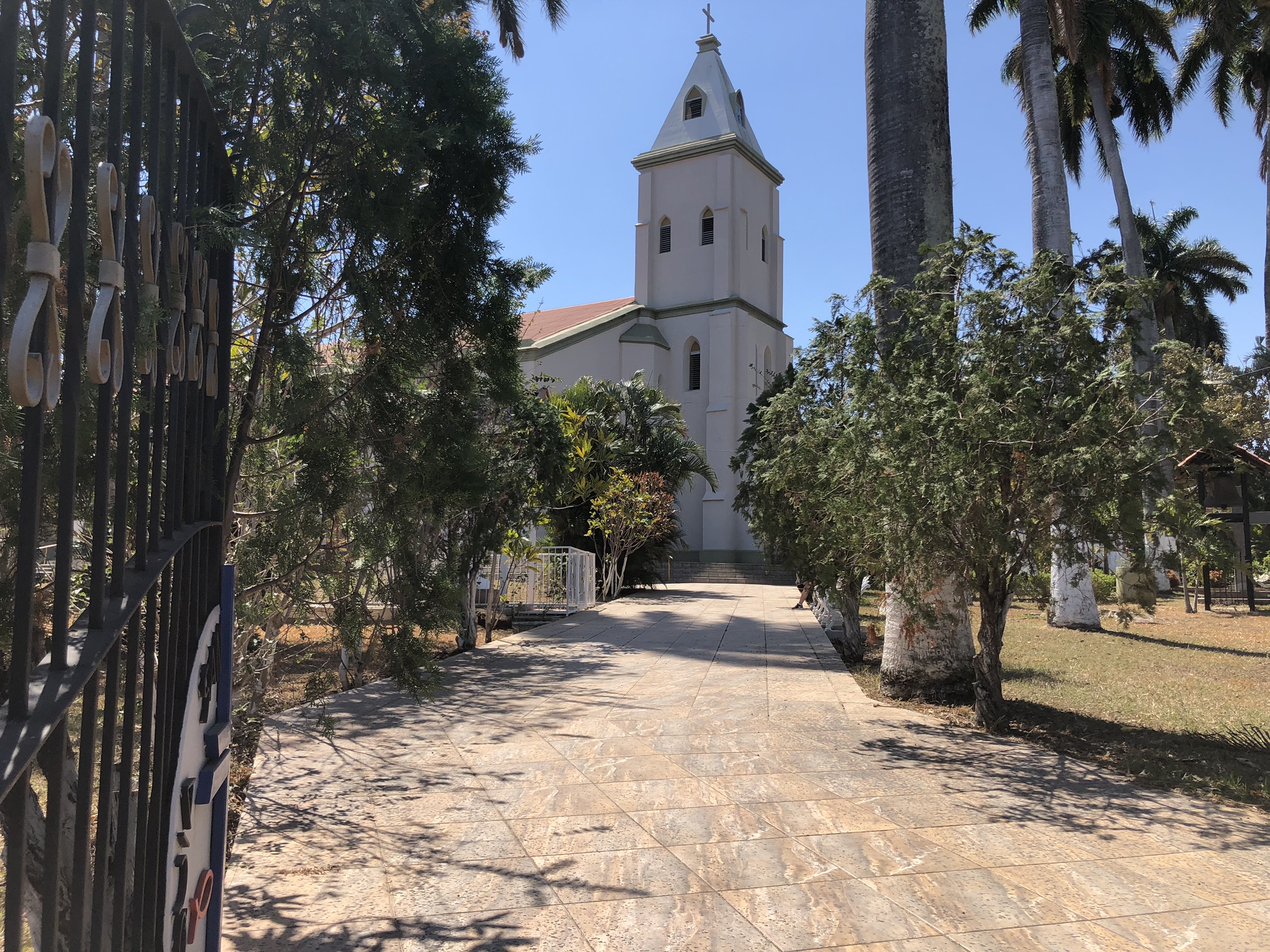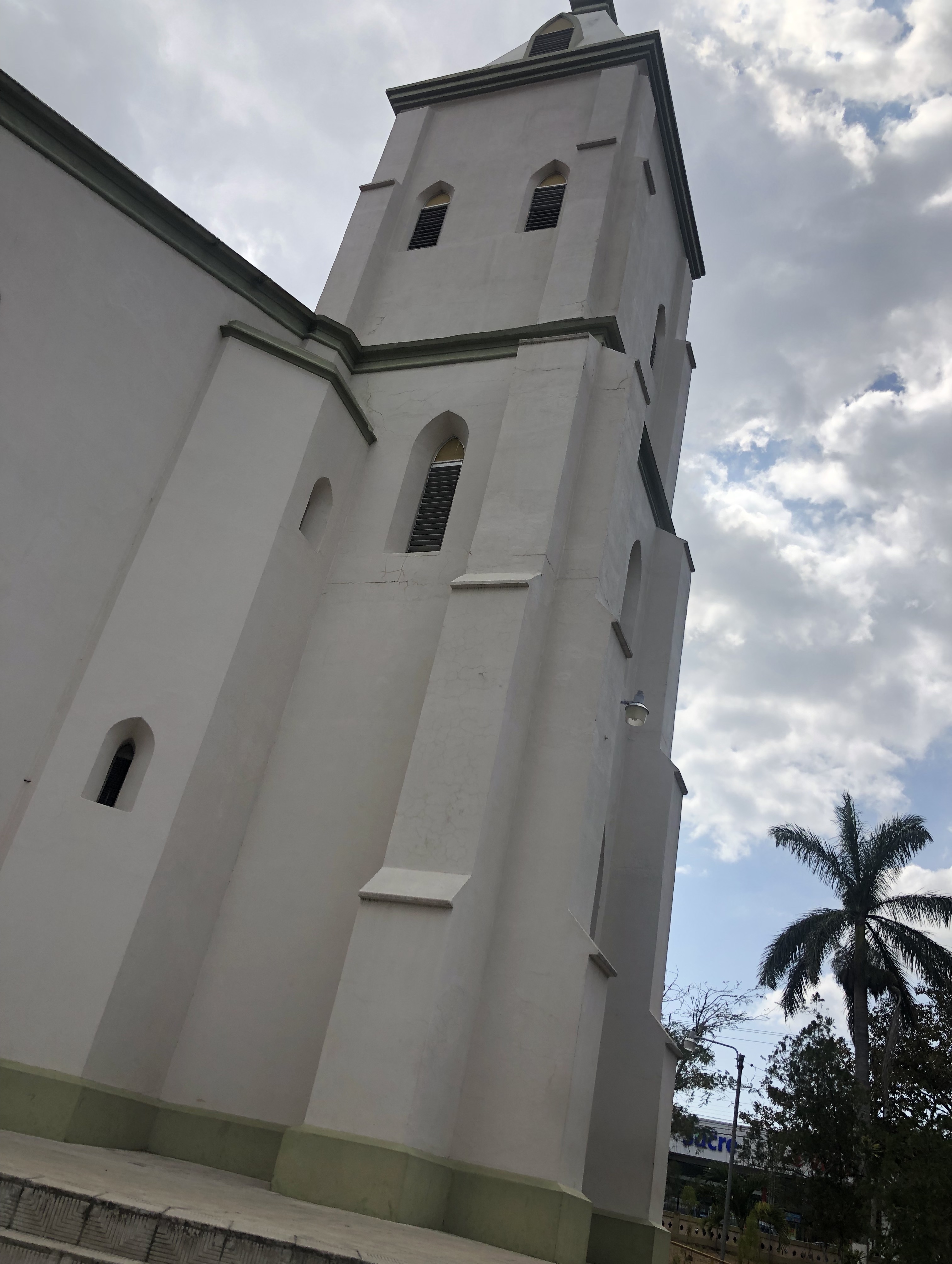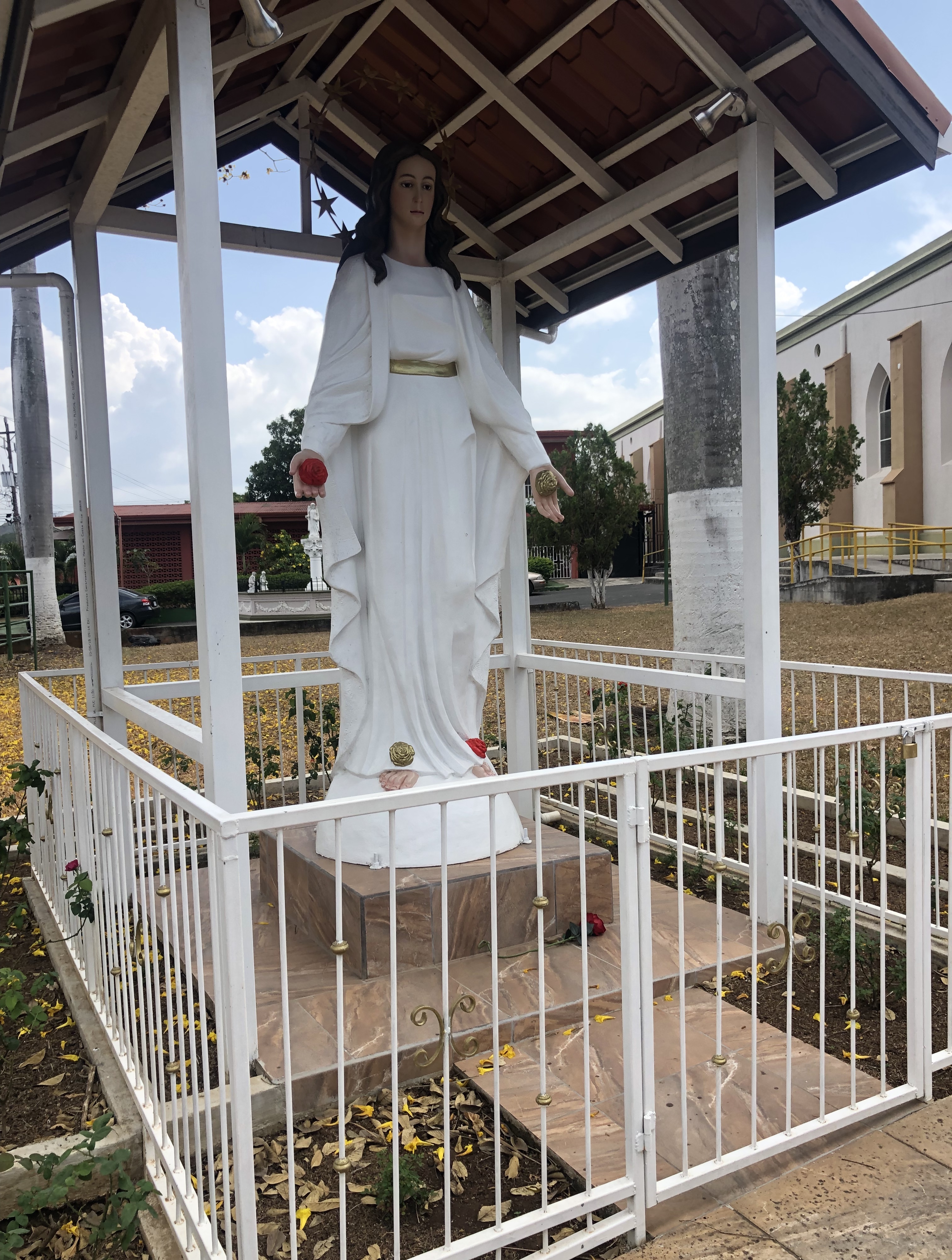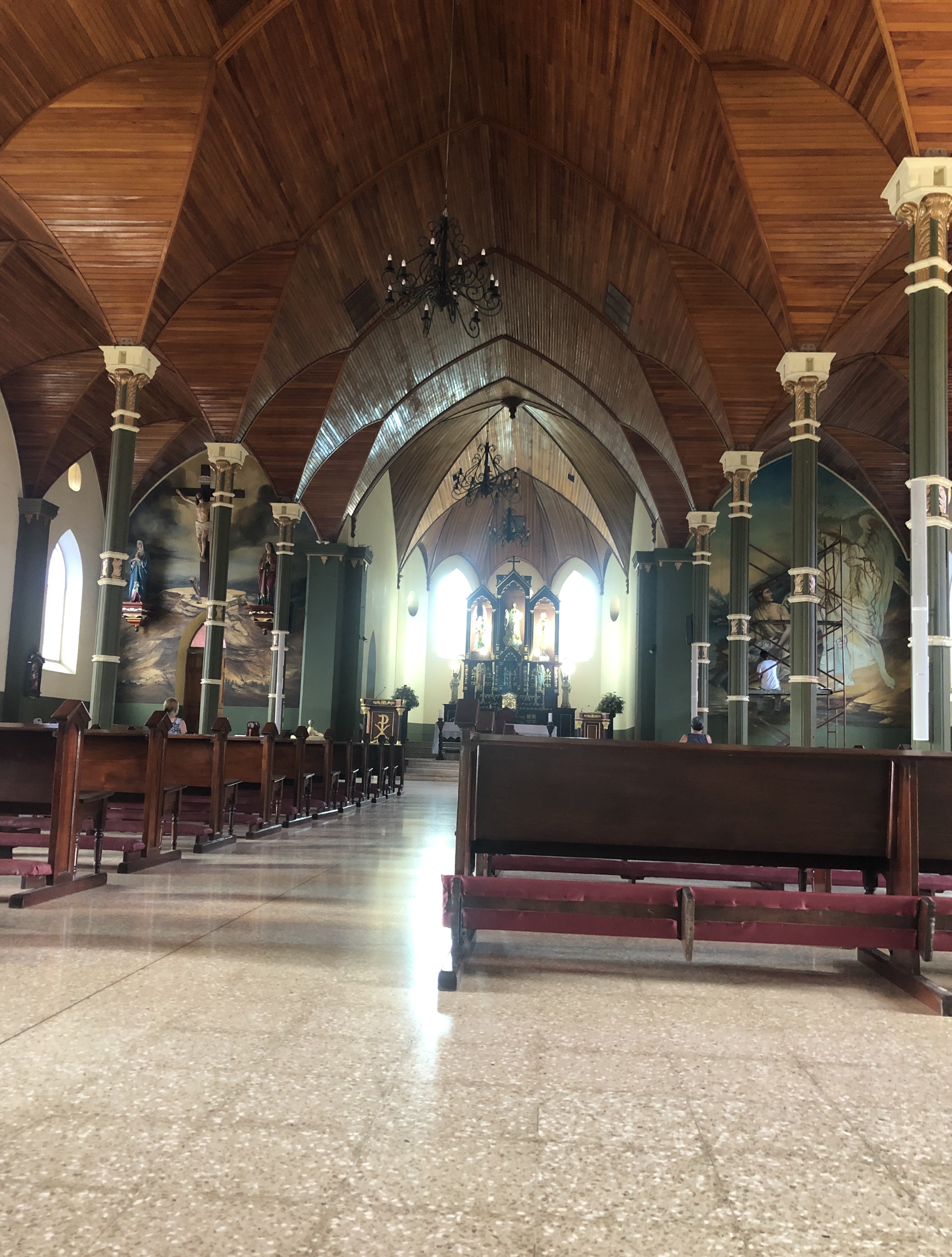 Our fourth host in Costa Rica told me about a joint nearby called Libreria, which is Spanish for “bookstore,” a produce market where you can also recharge your cellular minutes—he said they have some miscellaneous art/crafts stuff too. Street addresses don’t matter around here, we use GPS coordinates and/or landmarks to get where we’re going, our host said it’s right across the street from the big Catholic Church in the middle of town—this one: