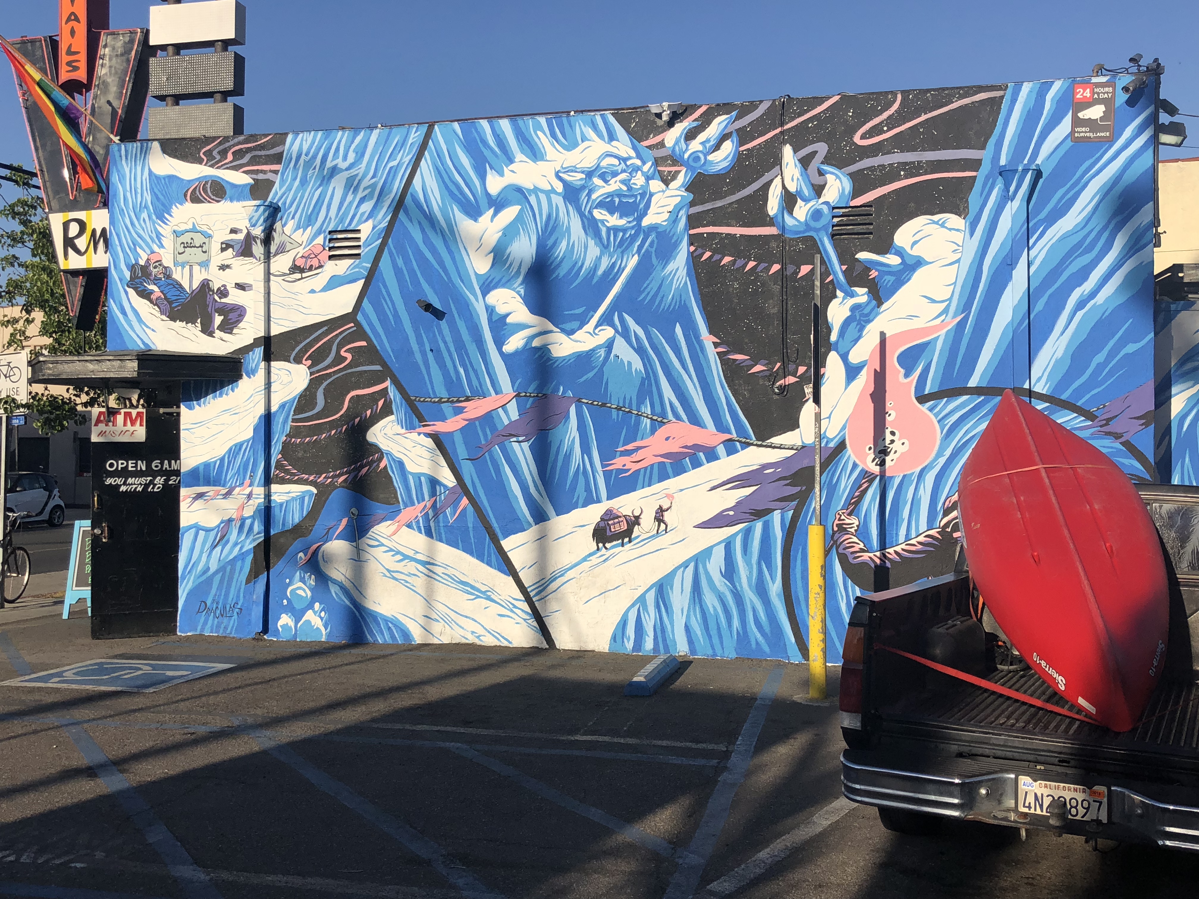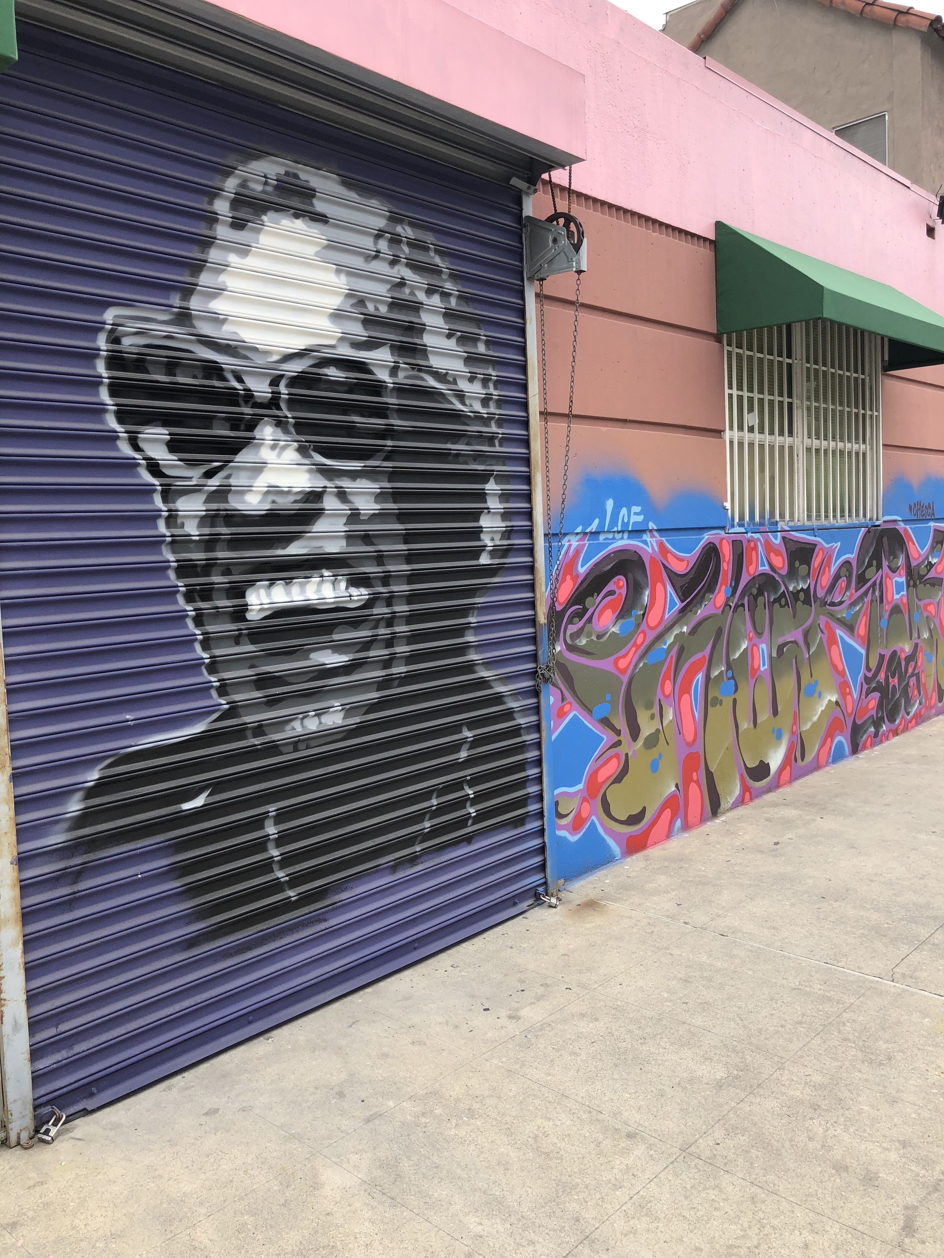 There’s a car wash on Broadway, just down the street from Roscoe’s Chicken and Waffles. They use compressed air when they dry your car. There’s several pieces of Street Art within walking distance. Just on the other side of the security fence is a painted pet shop: