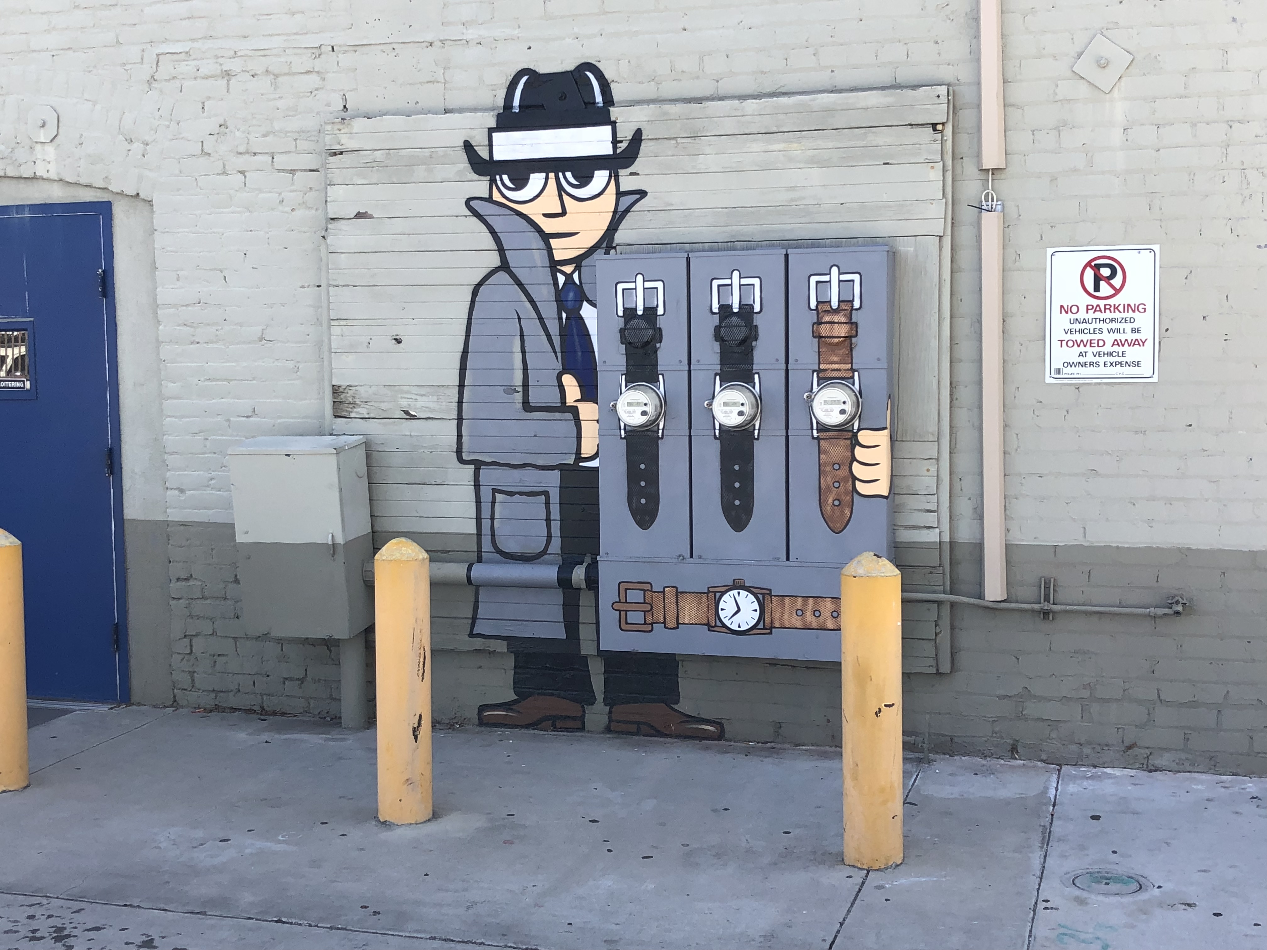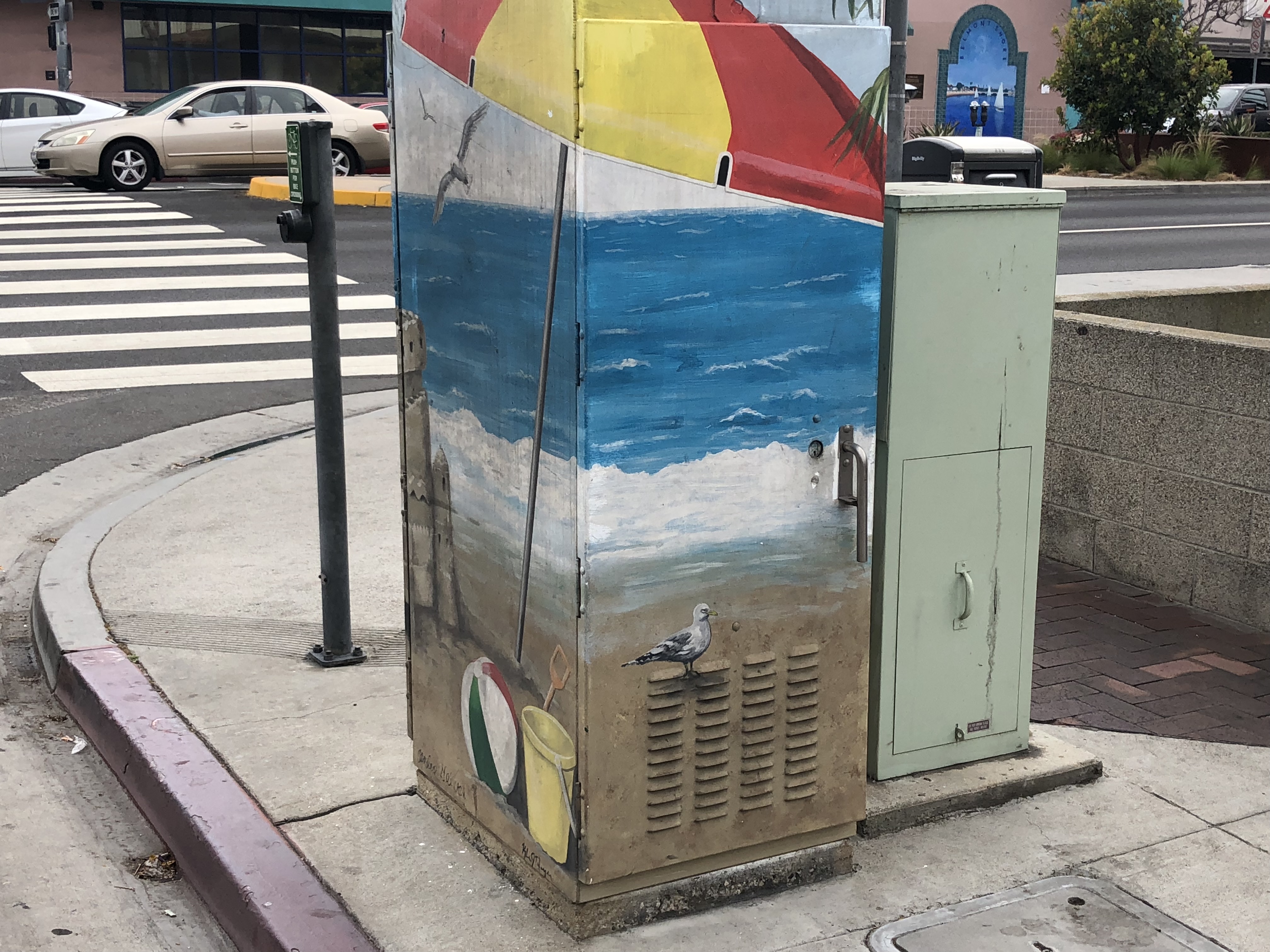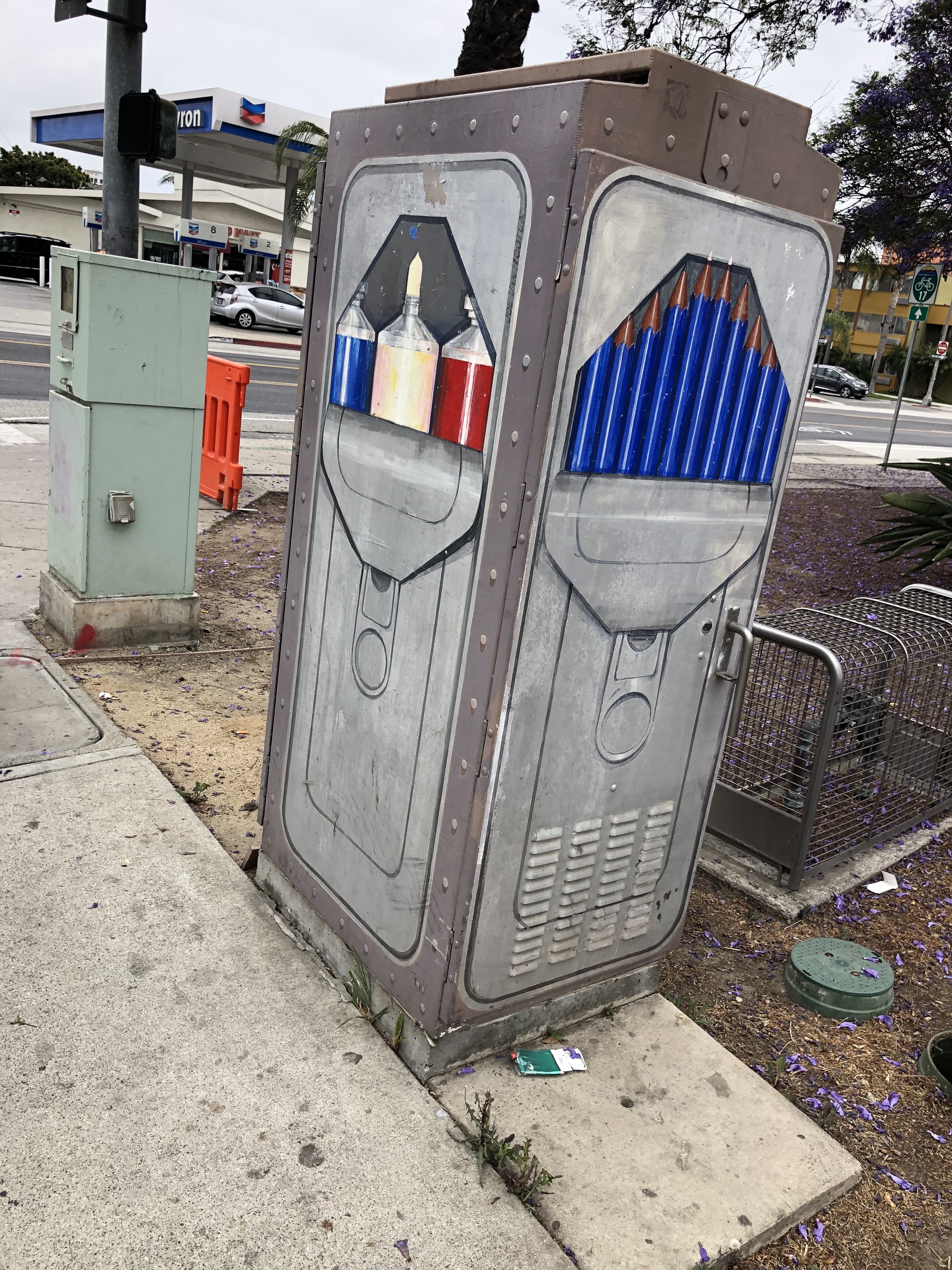 Don’t miss the data cabinet on the corner! Nearly every intersection in the city has phone/cable/fiber optics, etc. combined in “Combiner Boxes” and it’s rare to find one without paint: