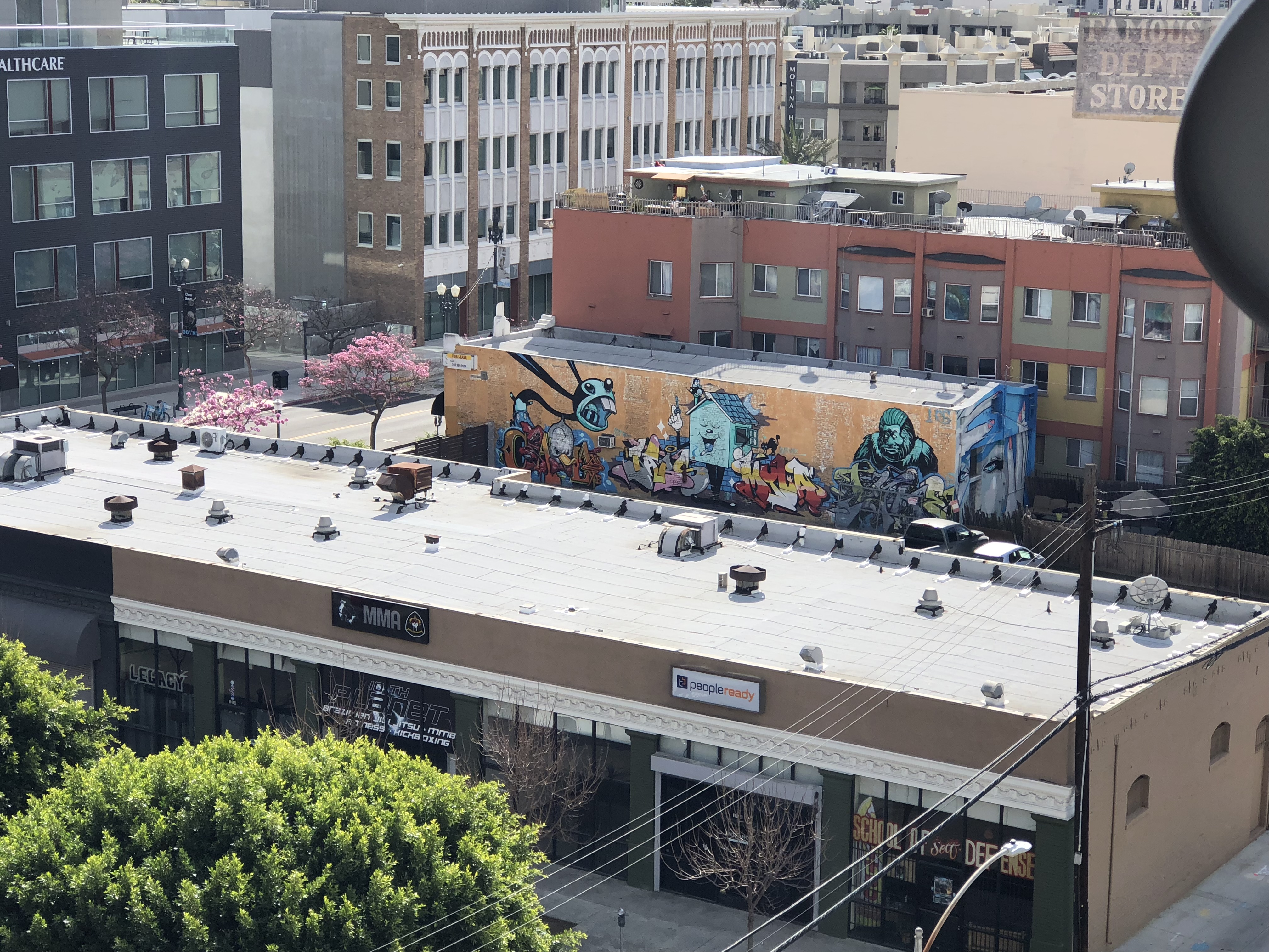 After class, stop by the Pacific Building on 7th and Long Beach Boulevard. The roof access on the south side has a lock that doesn’t latch, once you’re up there, look toward the east: