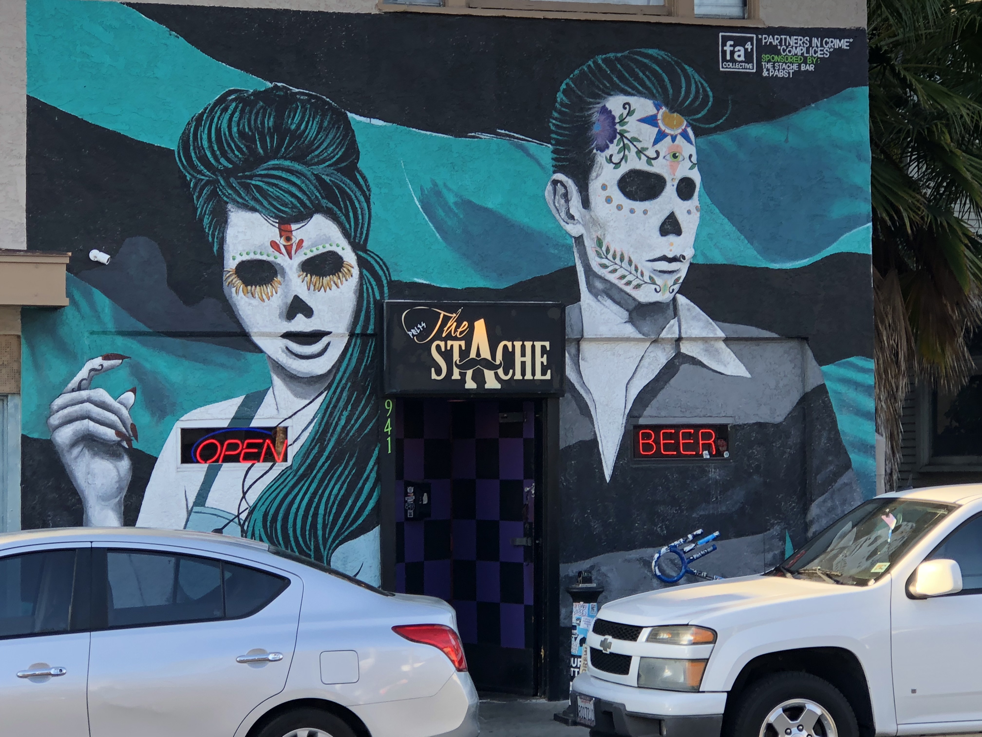 There’s a bar on Vintage Row called The Stache. On the main entrance side is a Dia De Los Muertos (day of the dead) mural. I like the way the neon signs in the bar windows look like name tags on the art work: