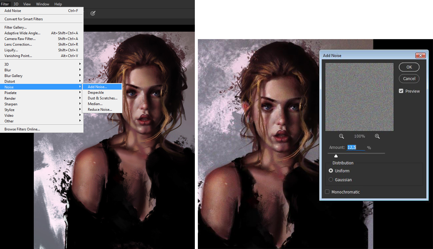 - Add noise filter (filter>noise> add noise)