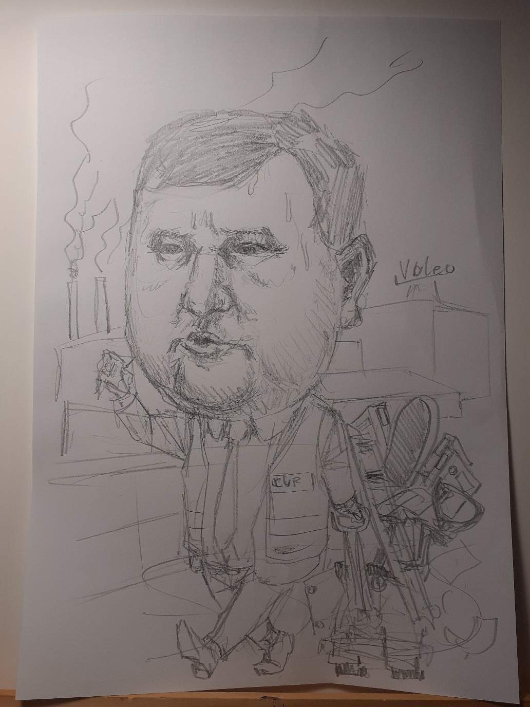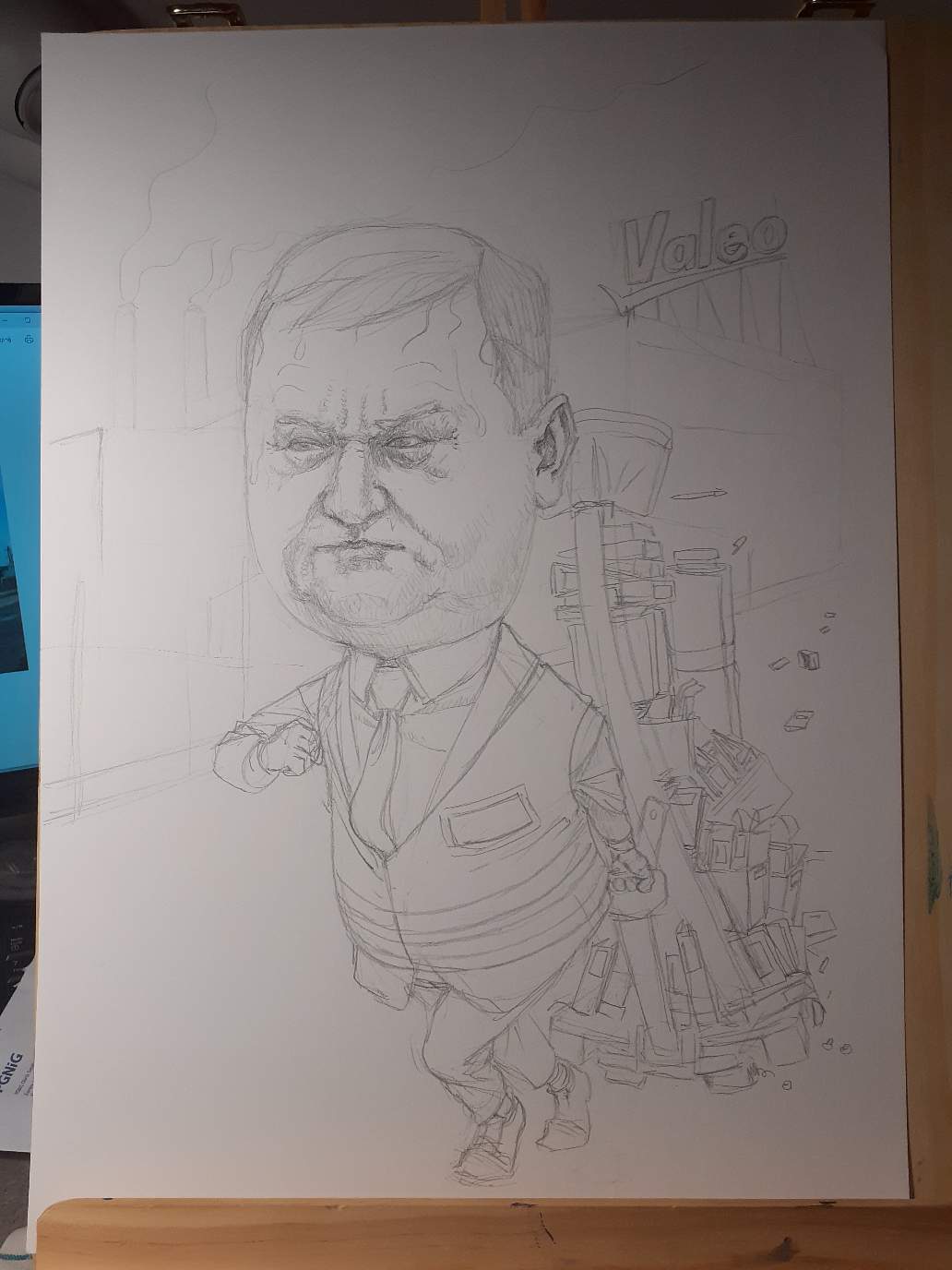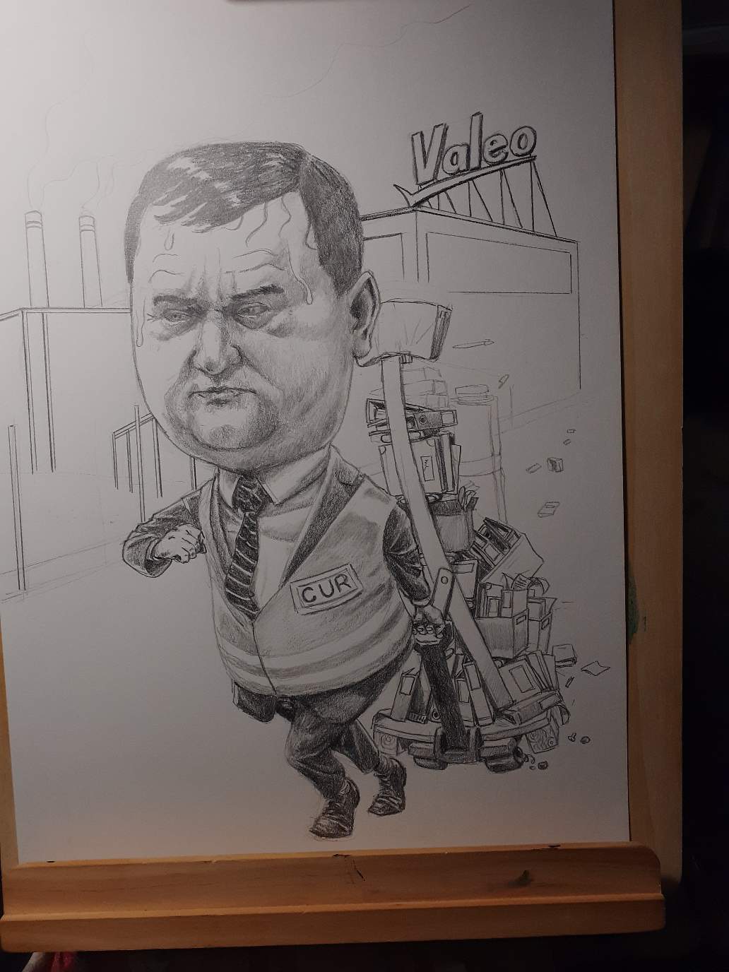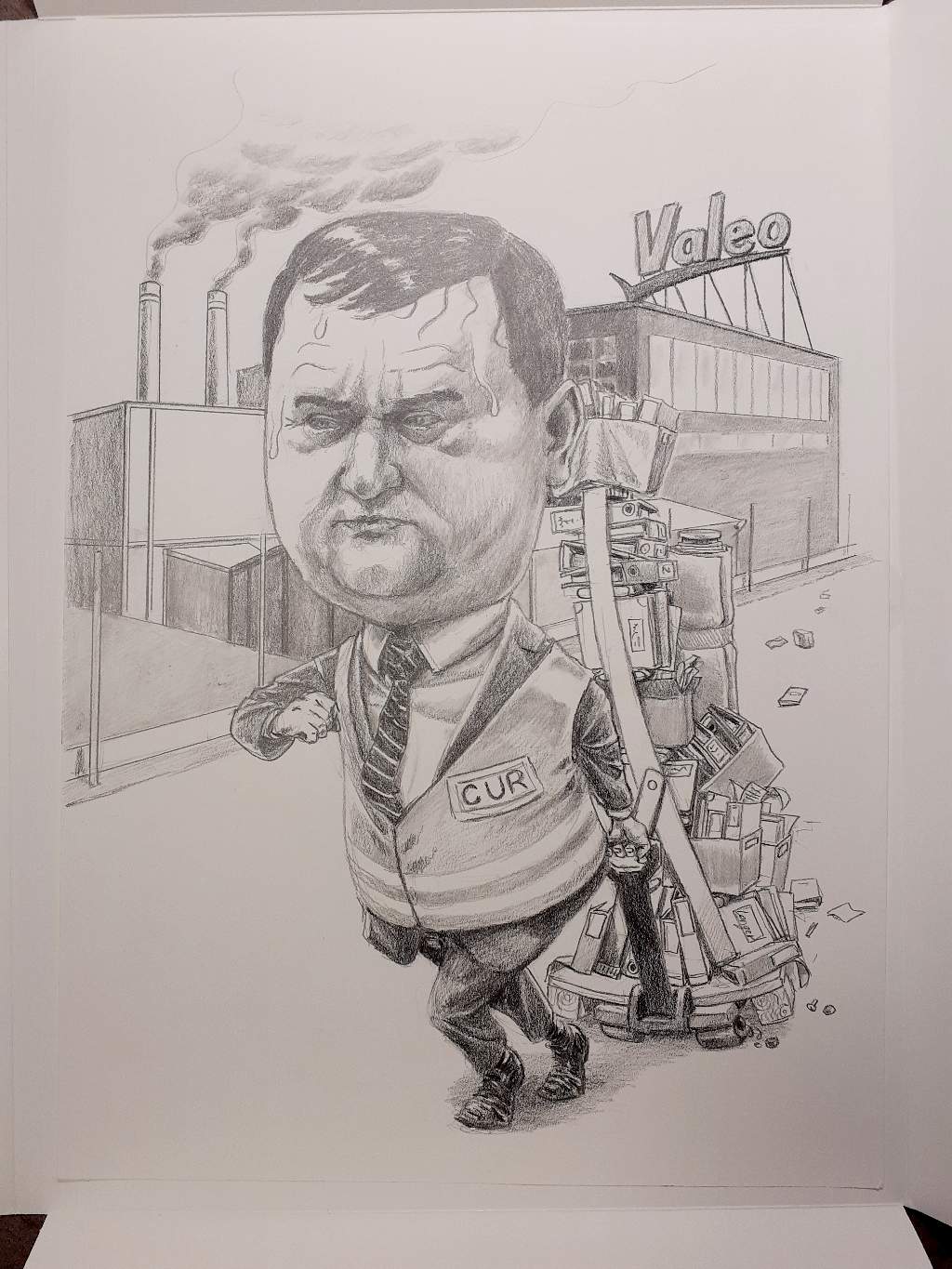I had received photos of described persons and a general idea of what should be included in the caricatures (mostly their now former workplace - Valeo and some inside jokes about their job)