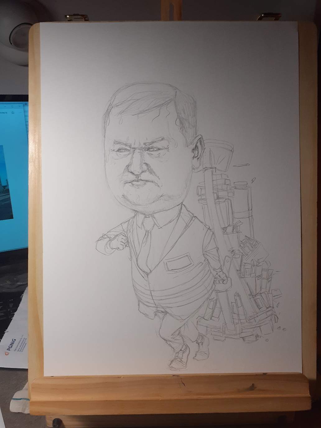 Not much look a like of the original photo and the head was taking too much space on sheet. Also the person that requested the drawing wanted to make him look more exhausted from dragging that cart.