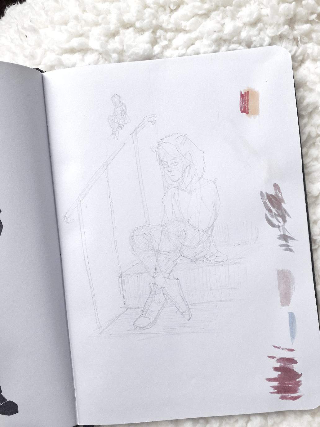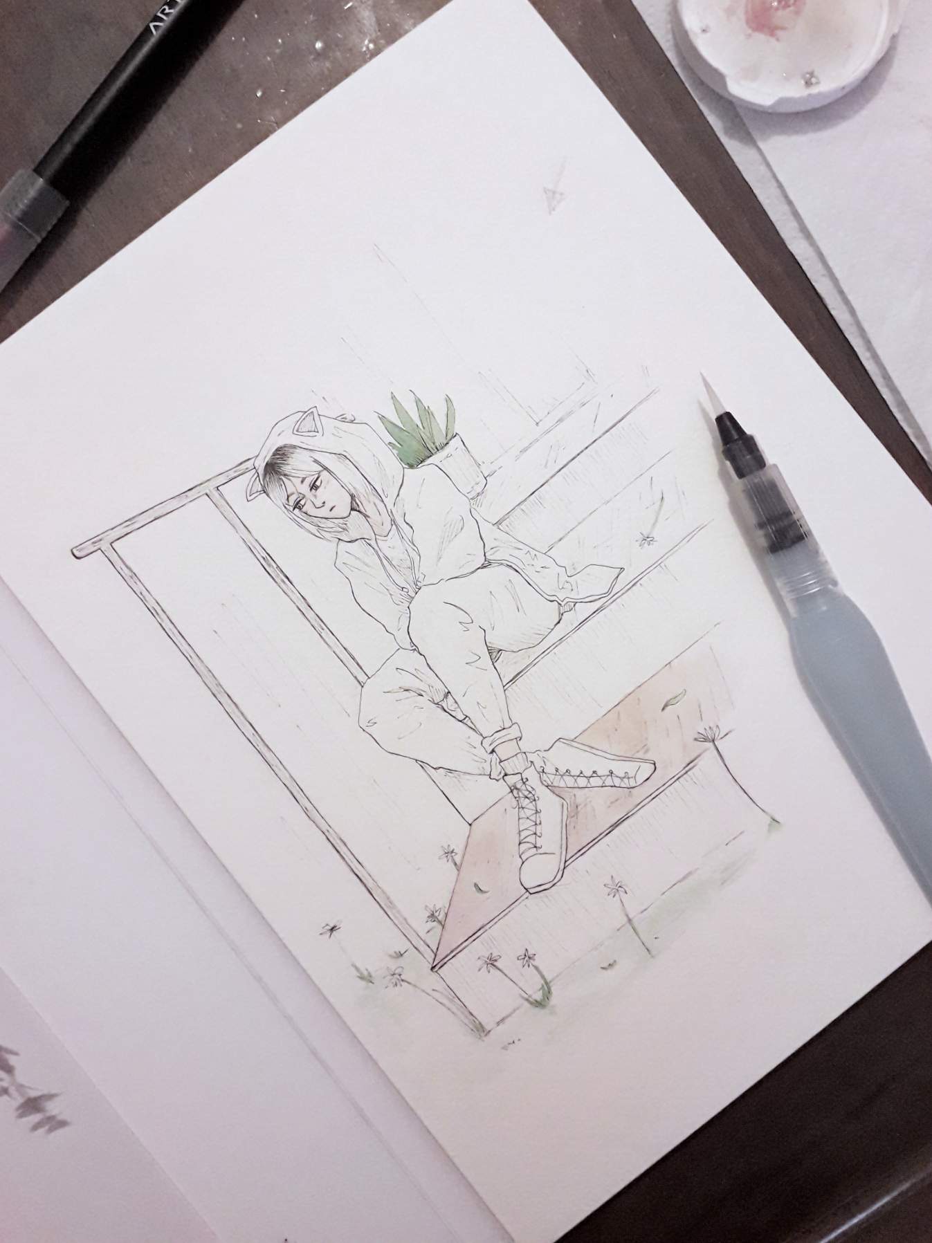 Questo è lo schizzo che ho fatto su un'altro quaderno per decidere la posa, poi l'ho disegnato di nuovo sulla carta da acquerelli.