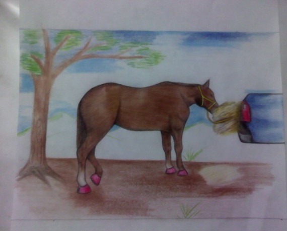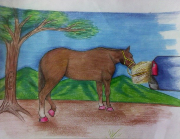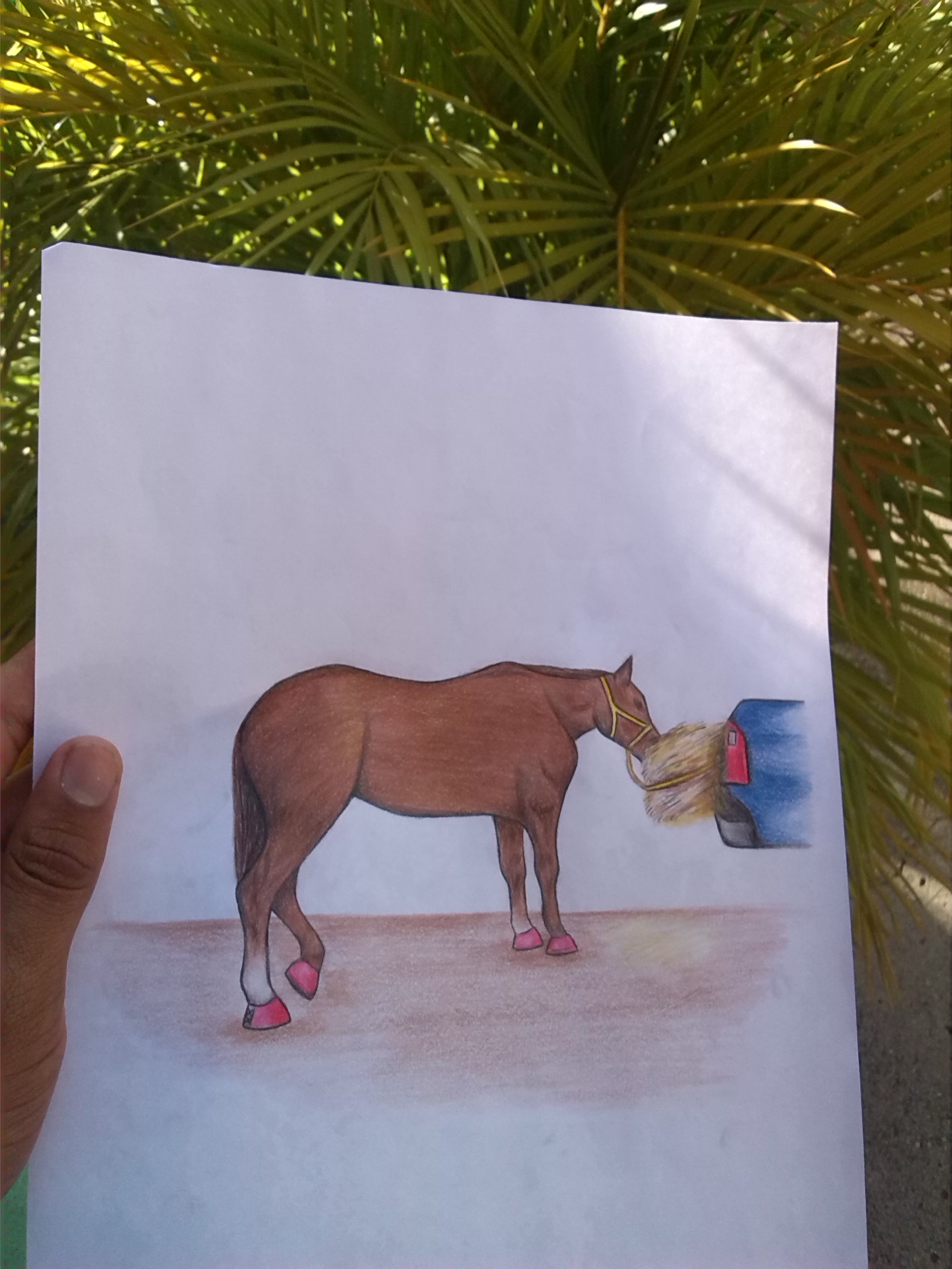 In this first work, I worked in detail on the horse's body, applying a light brown tone with base, and applying darker shades to produce light and shadow, and highlight the body and its musculature.